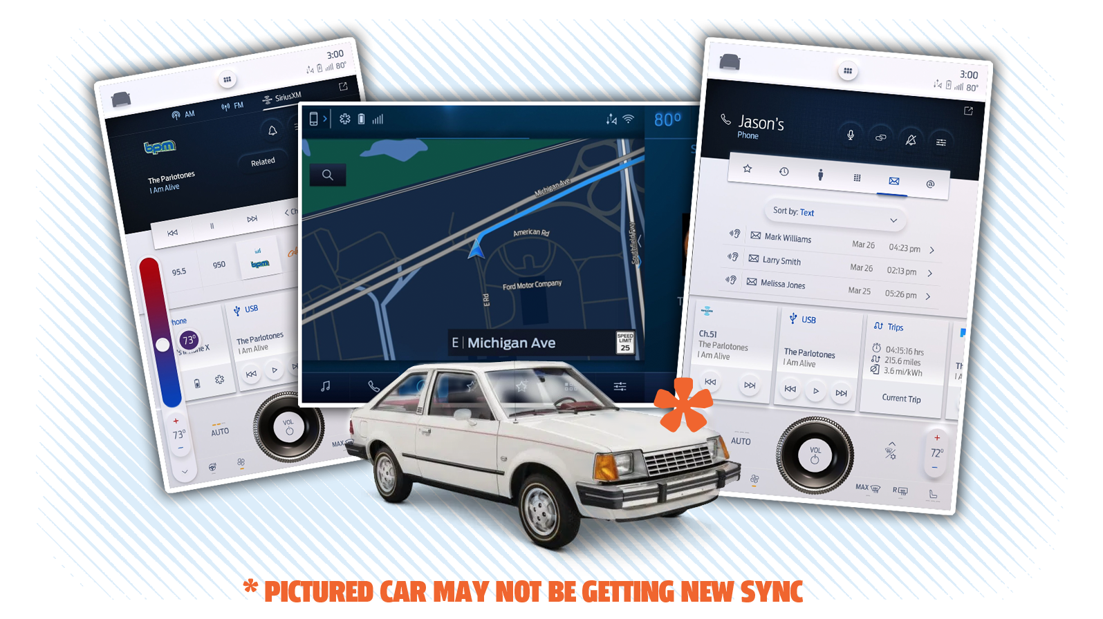 The demonstration unit that Ford shared with journalists included physical volume controls below the horizontal screen, with a volume knob on the left, a "tune" knob on the right, and play/pause/change channel and other radio control buttons in between.
