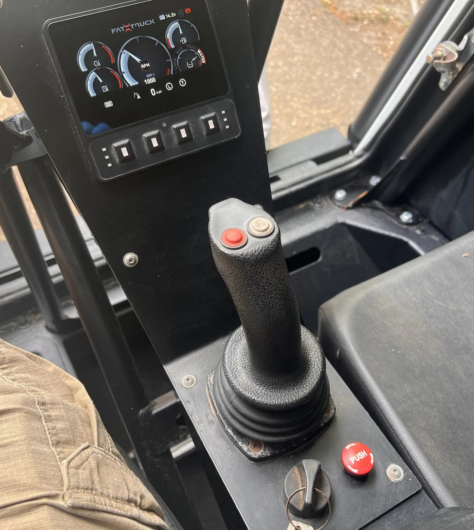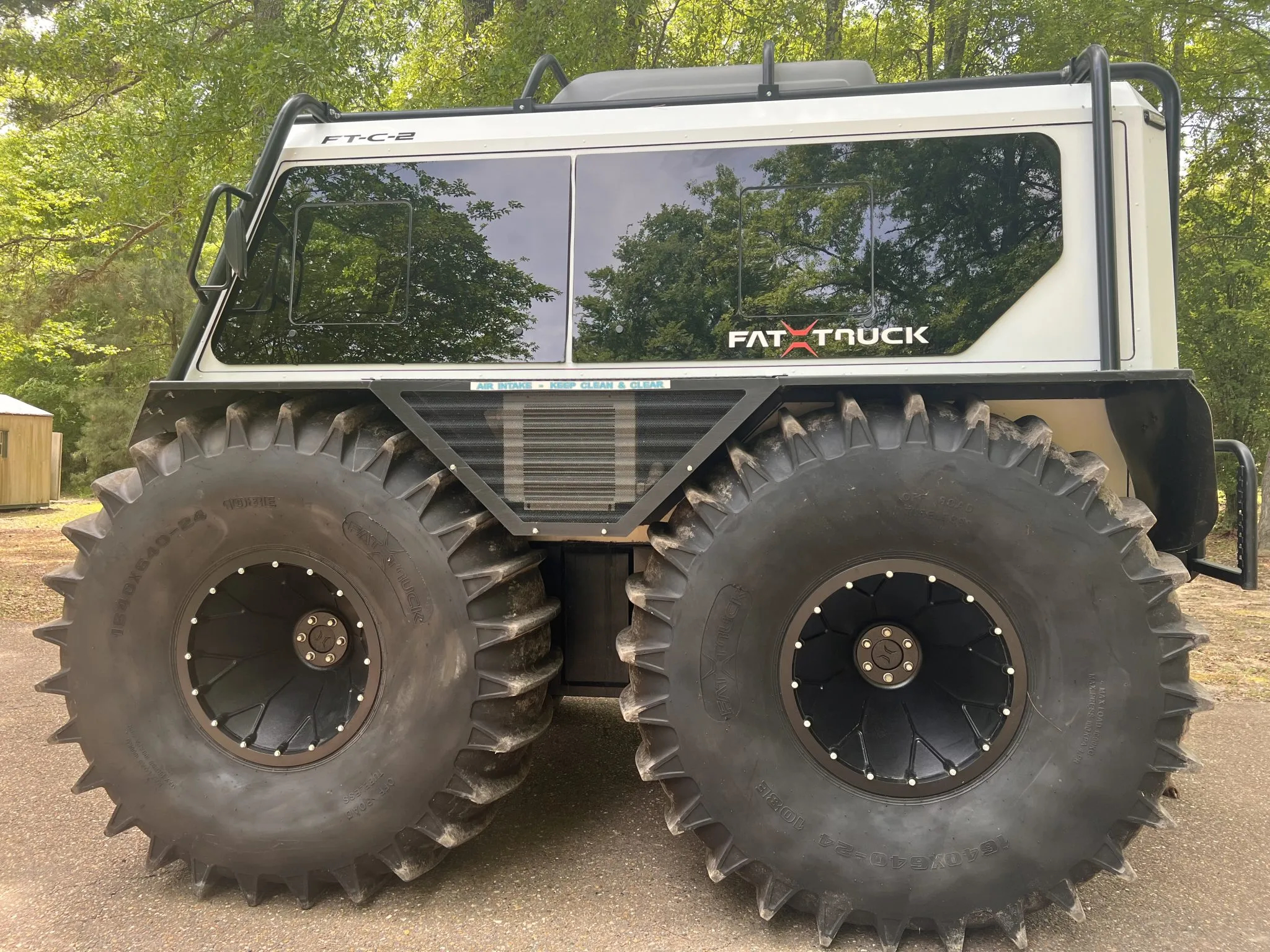 The interior is certainly utilitarian, but it features niceties like air conditioning, a reverse camera, bucket seats and shoulder belts. The panel fitment and finish is likely on par with the Cybertruck's. And unlike the Cybertruck's controversial steering setup, the Fat Truck is steered via a joystick which allows users to drive from either side of the vehicle. This stubby looking beast is powered by a Caterpillar 2.2-liter turbodiesel four cylinder engine that produces a factory claimed 67 horsepower that naturally gets sent to all four wheels. This surprisingly small engine can get the Fat Truck up to a top speed of 25 miles per hour on land, and 3.1 miles per hour on water according to the Fat Truck website.
