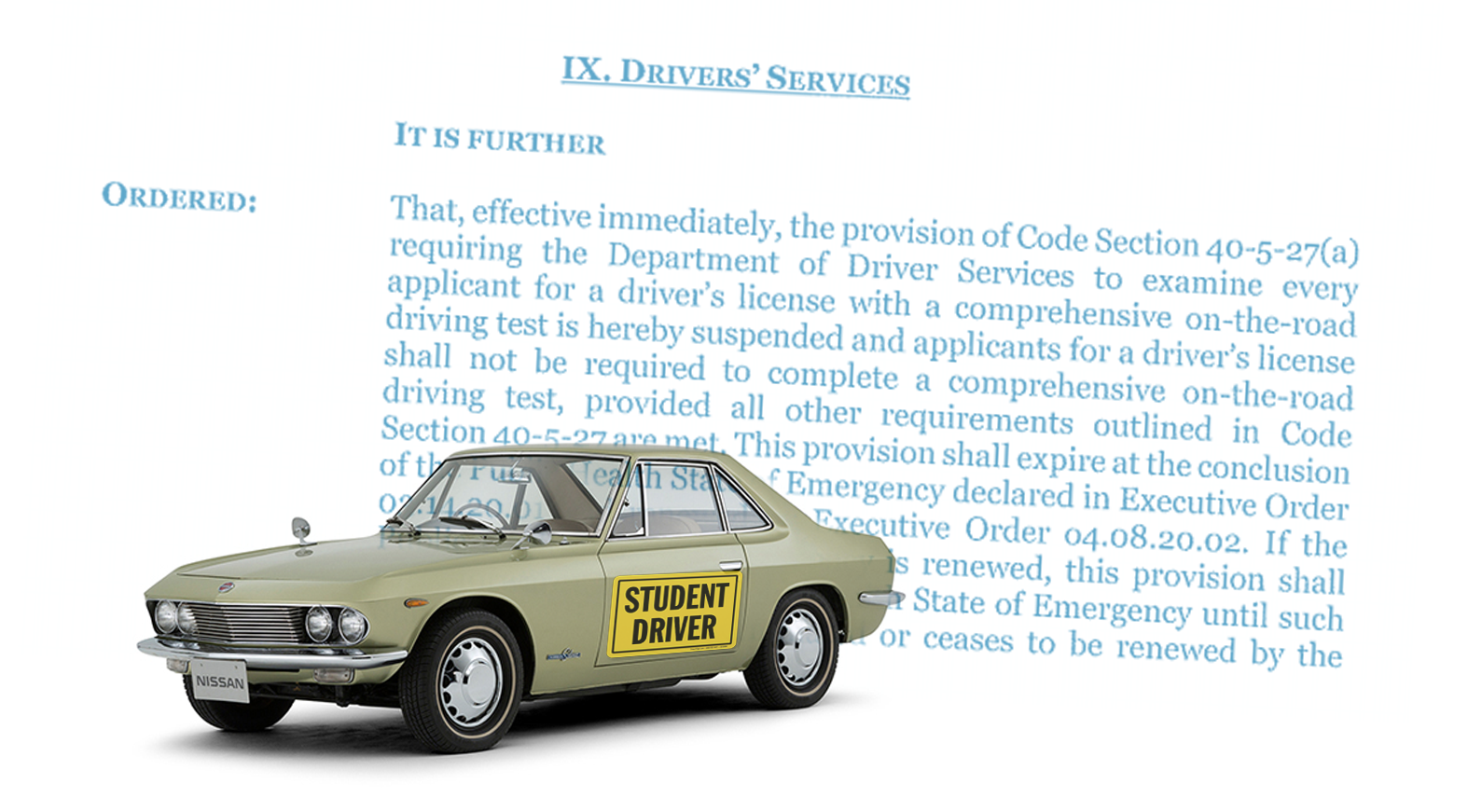 The whole point of this is, of course, that maintaining a safe physical distance of six feet would be effectively impossible in a car with a student driver and a testing official.