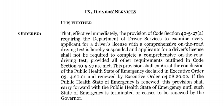 That, effective immediately, the provision of Code Section 40-5-27(a) requiring the Department of Driver Services to examine every applicant for a driver's license with a comprehensive on-the-road driving test is hereby suspended and applicants for a driver's license shall not be required to complete a comprehensive on-the-road driving test, provided all other requirements outlined in Code Section 4-=5-27 are met.