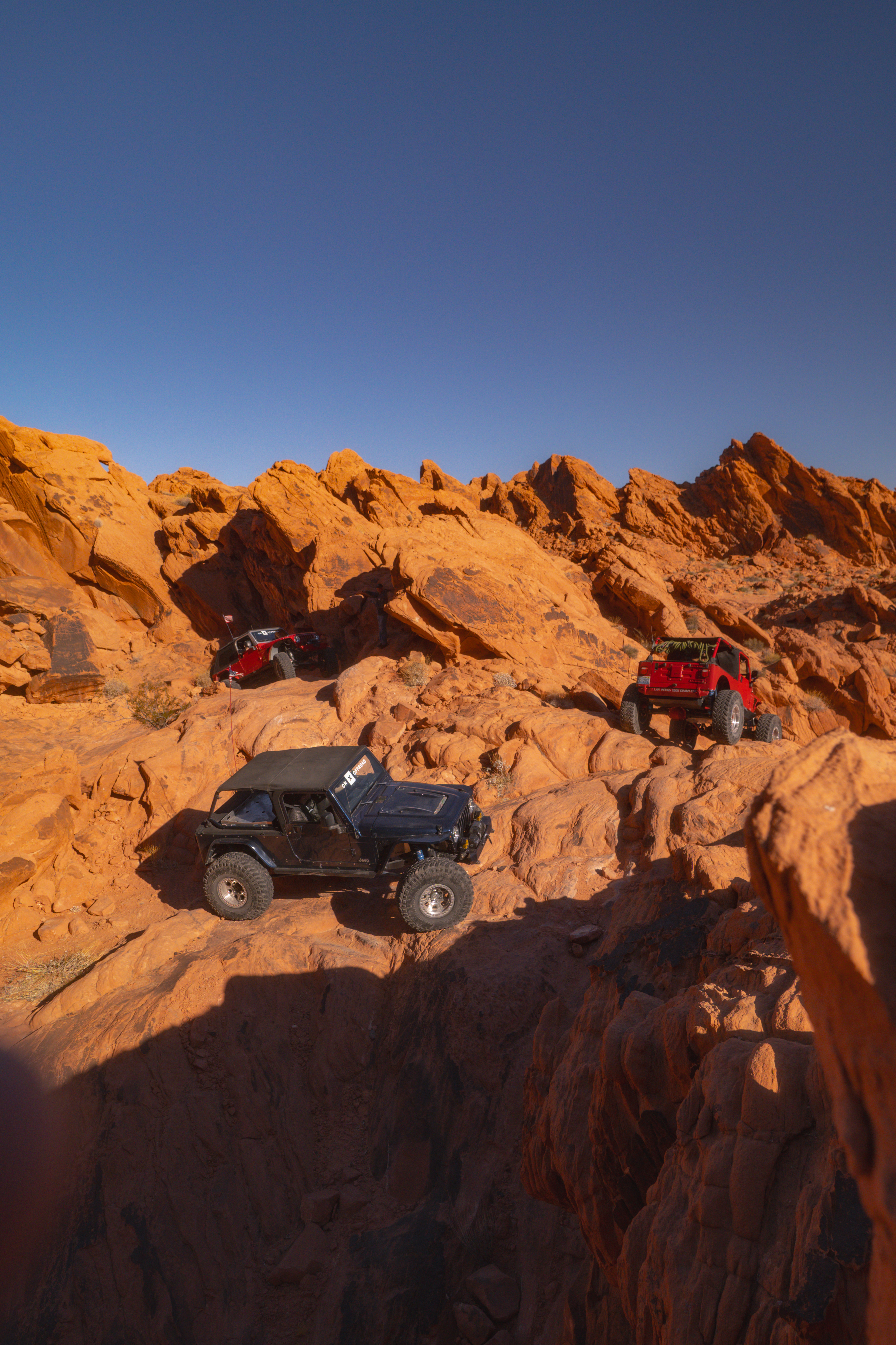 Bright and early, just after sunrise I pulled up to my Jeep for the day. For the sake of standing out in a crowd, I decided to pick the one blue TJ in a group of red. Once we signed our waivers and stowed our luggage, we headed out to the trails about an hour due east of The Sin City near Moapa Valley. Once we'd reached the trailhead we all off-loaded and aired down the tires for ultimate rock-scrabbling grip. Then it was off into the depths of the remote off-road trails.
