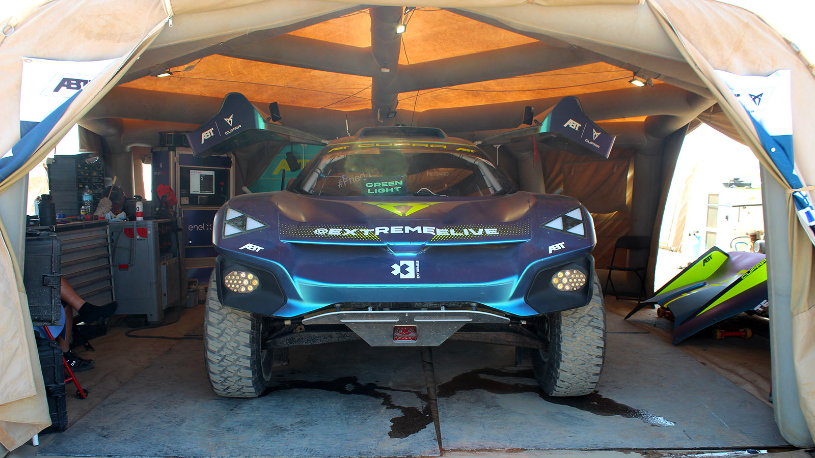 Each of the ten teams facing in Extreme E has its own garage on the pit lane. From there, they can get their Odyssey 21 electric racers set up for a weekend of racing. It's also here that they'll make repairs after any collisions that happen over the course of the race weekend.