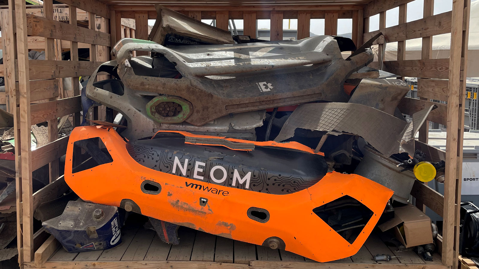 After all that racing, there's a sizable pile of body panels ripped up and ready for the trash. But, because this is Extreme E, these damaged parts aren't simply shattered panels of carbon fiber; instead they're composed of natural fibers.