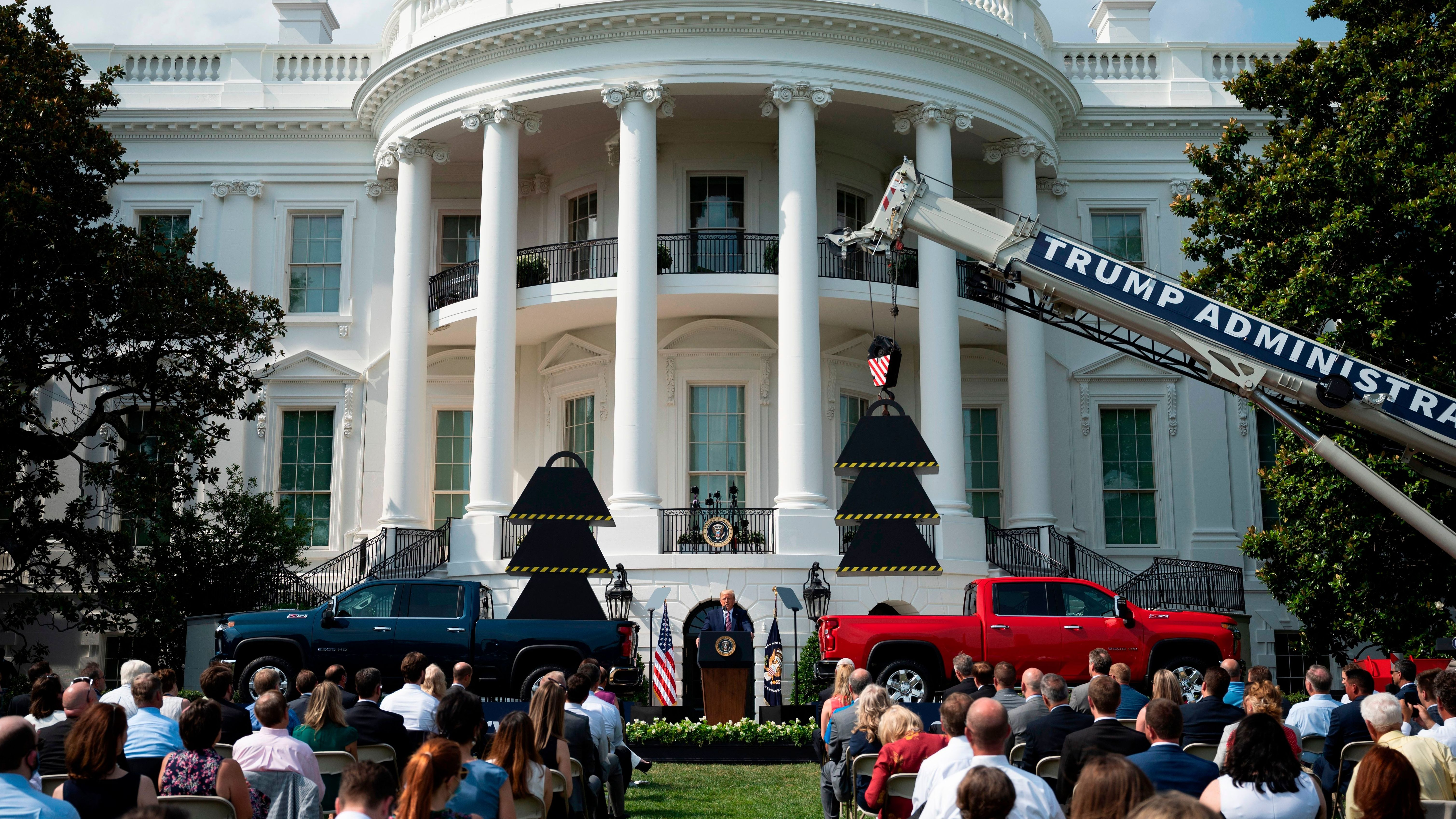 President Trump, Vice President Pence, and a few other folks addressed the public on a White House lawn in front of two heavy-duty Chevy Silverados and a crane today. General Motors, apparently, had nothing to do with this.