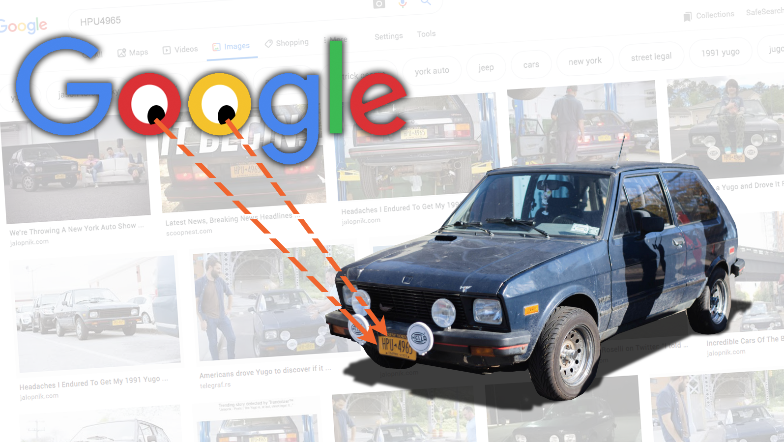 Woah, damn! Because this car has been photographed and written about a good bit, there's a lot of results here, and my name and other Jalopnik employees' names show up in those top links, too. Of course, I should mention that at no point did we tag the Yugo's license plate number to any of these photos—that's all behind-the-scenes Google black magic.