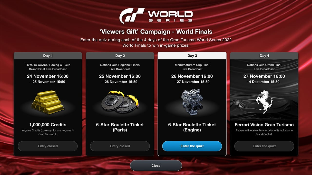 In fact, several rewards await GTWS viewers. Between Thursday and Saturday, players can answer questions — presumably with information displayed during the event's livestream — for the chance to win 1 million in-game credits, a special part, an engine and the aforementioned Ferrari concept. Sport Mode races will also see higher payouts during the 25th anniversary festivities, and there's one more big feature coming to GT7: the ability to sell cars. That last one had been a very, very long time coming indeed.