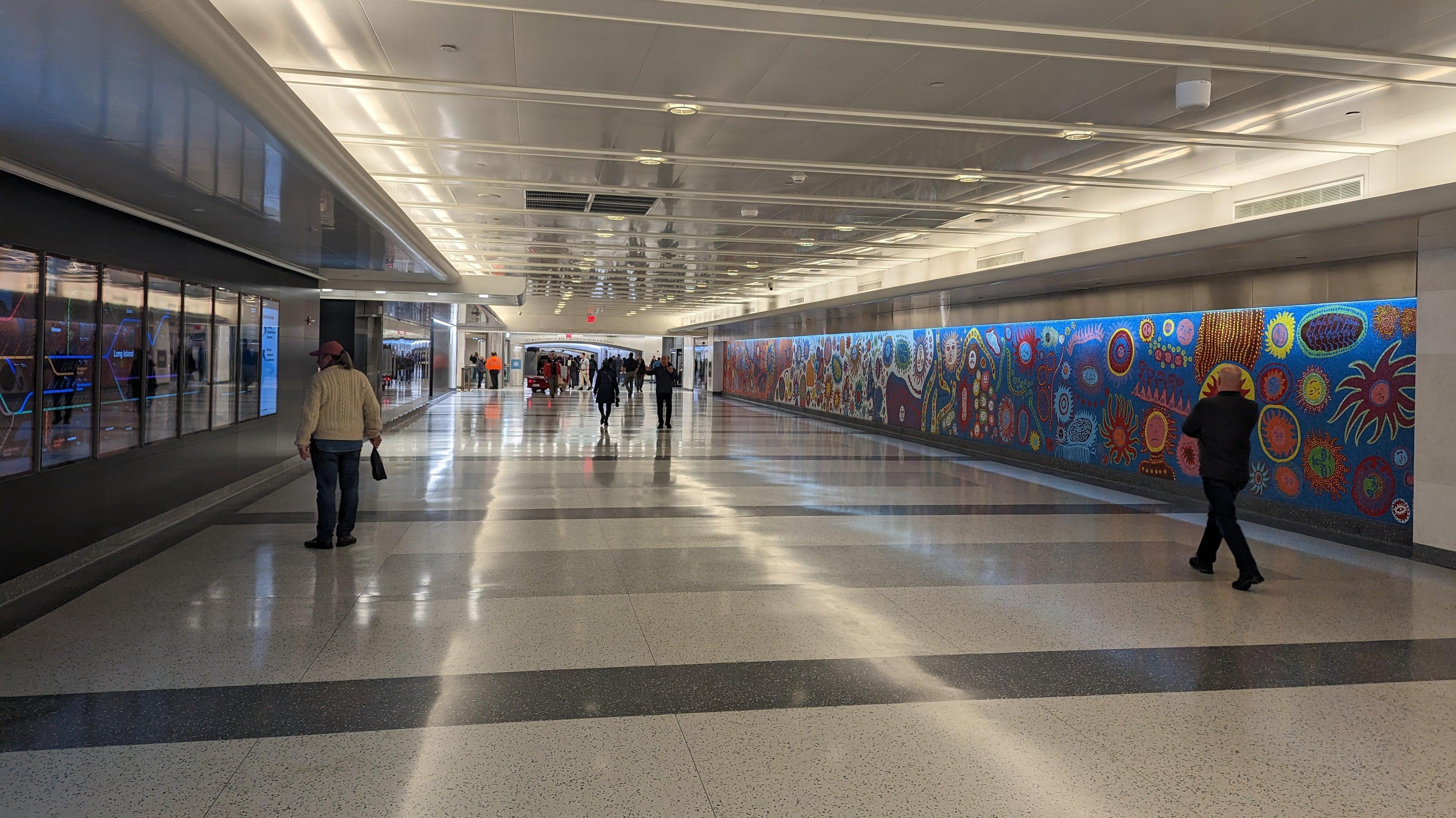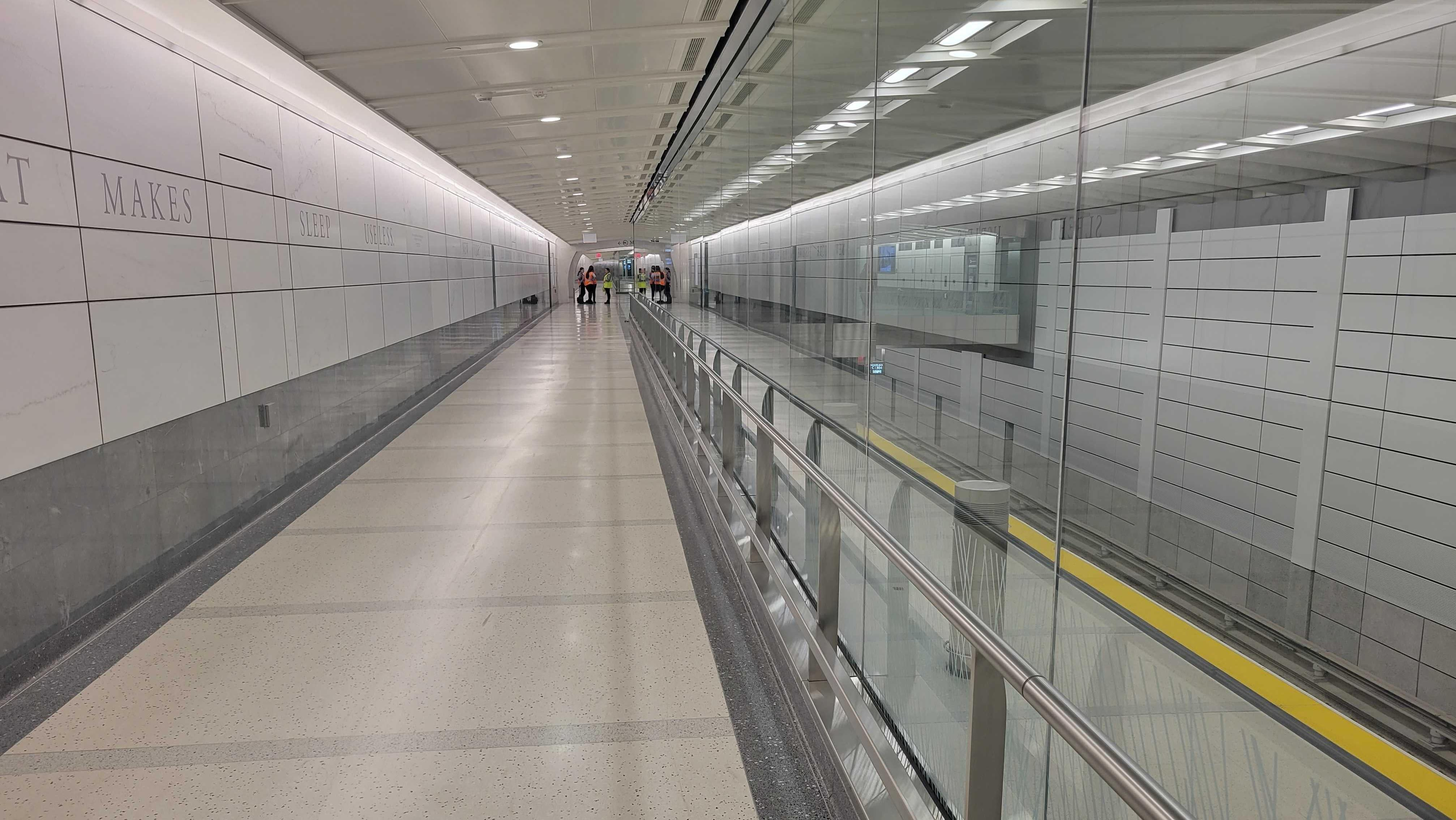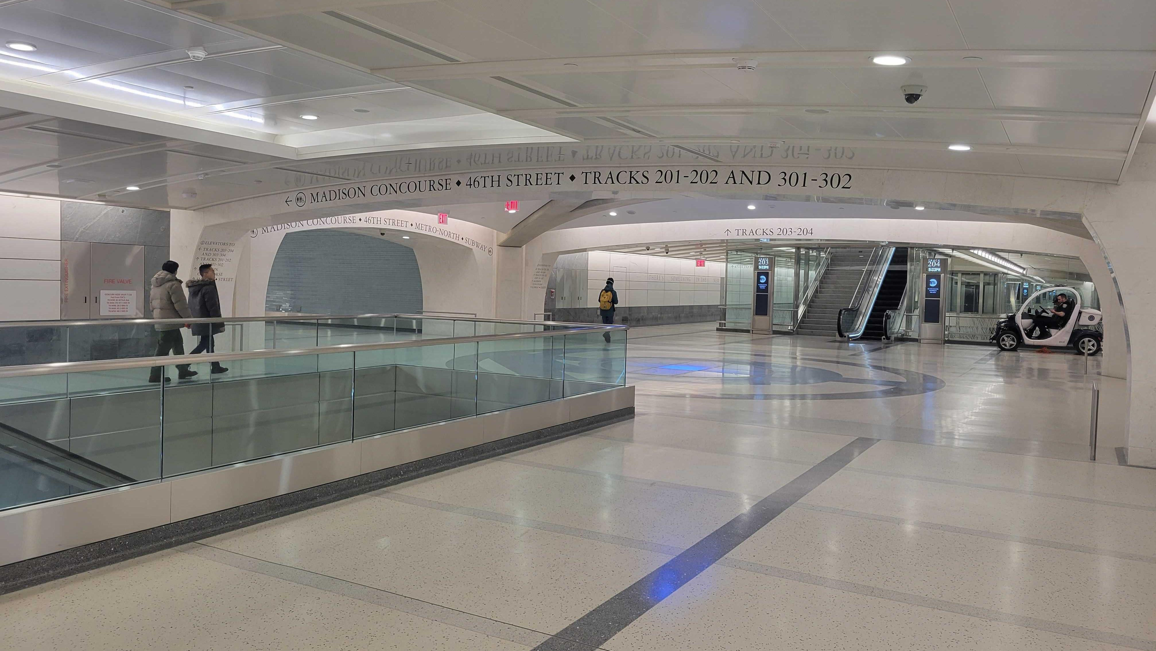 Glossy marble cladding covers Grand Central Madison's walls. While the new terminal look clean and modern, the appearance can come off as stark and barren. The Metropolitan Transportation Authority decided to fill the space by presenting inspirational quotes about New York City from famous New Yorkers to passengers at the mezzanine level, just about the platform. The ten quotes selected were inscribed along the wall in large letters, and then concisely presented in full at the end.