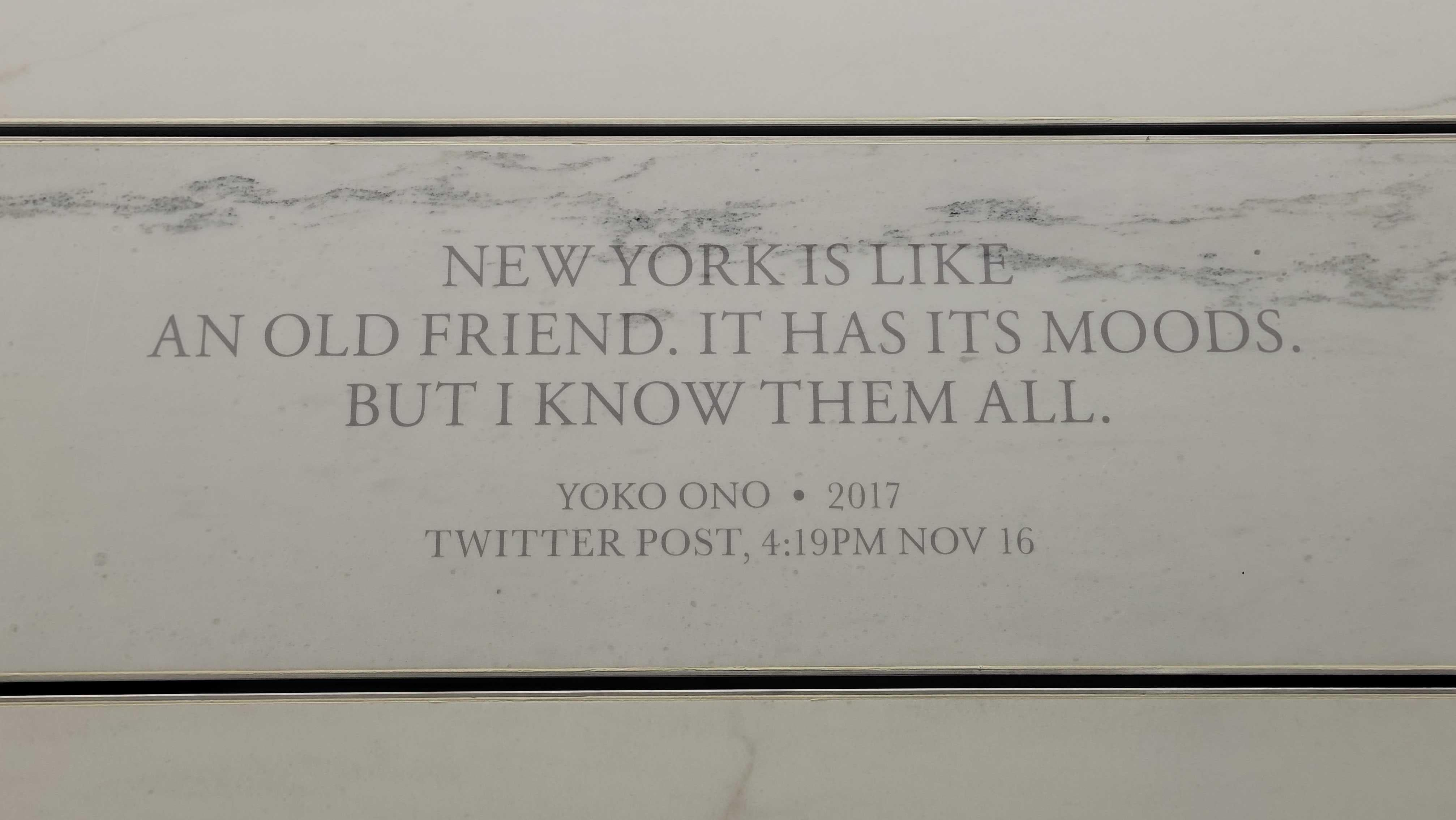 The Japanese artist and activist most well-known for her marriage to John Lennon, has a quote on the mezzanine wall: "New York is like an old friend. It has its moods. But I know them all." It's an honest description of what it's like to live in New York City, but it's a tweet. Yoko Ono is arguably one of the city's most significant residents, but it's a tweet. The MTA cited it as a tweet on the wall, including a down-to-the-minute timestamp like you'd see in a blog post.
