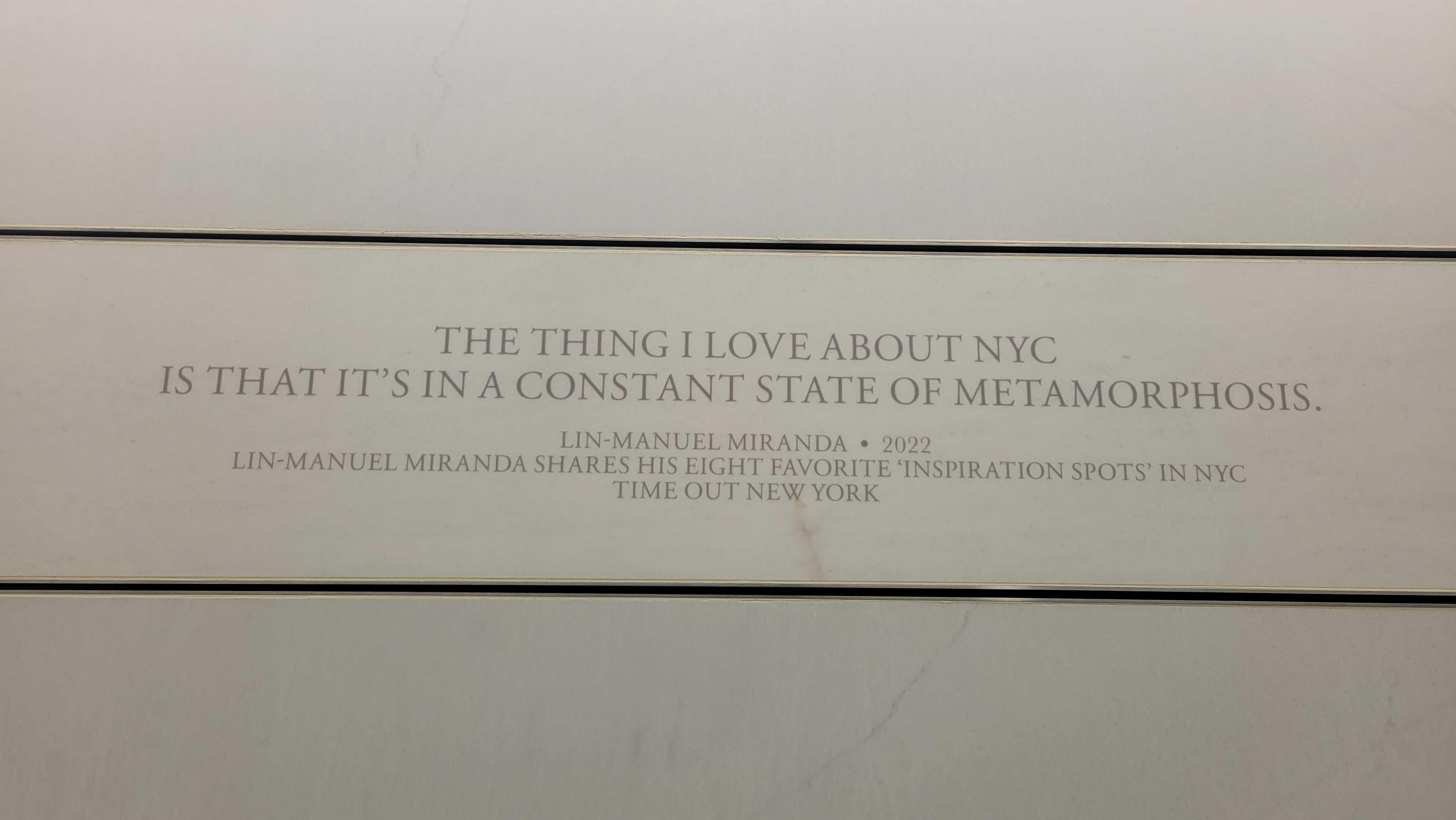 The MTA made a few other weird choices. The agency decided to use a quote from Broadway star, writer and composer Lin-Manuel Miranda. The quote just happened to be from a 2022 interview with Time Out, a tourism and restaurant website, about his eight favorite "inspiration spots" in the city. I understand the MTA not wanting anyone to question the authenticity of these quotes, but the citations make the words seem instantly dated.