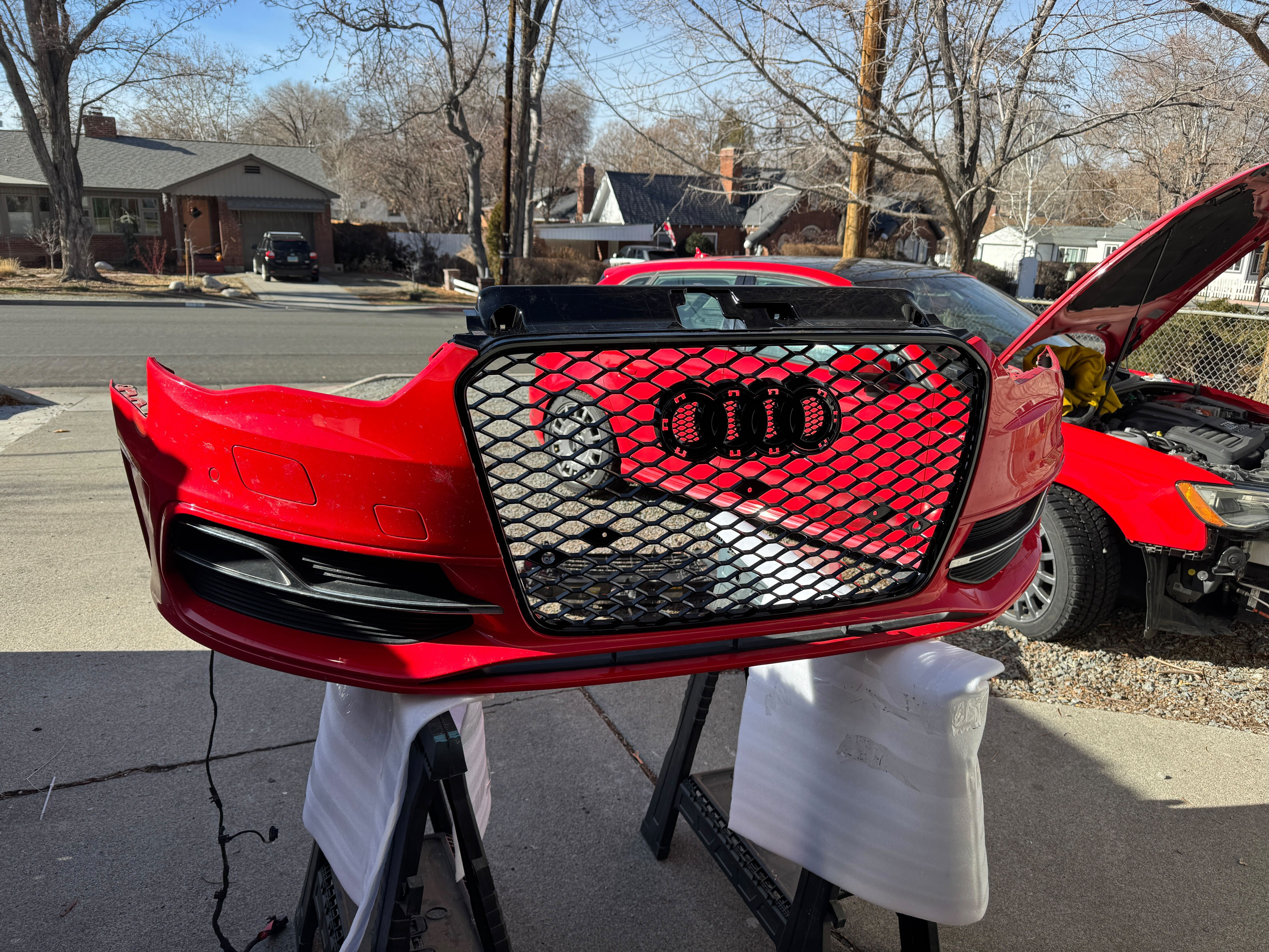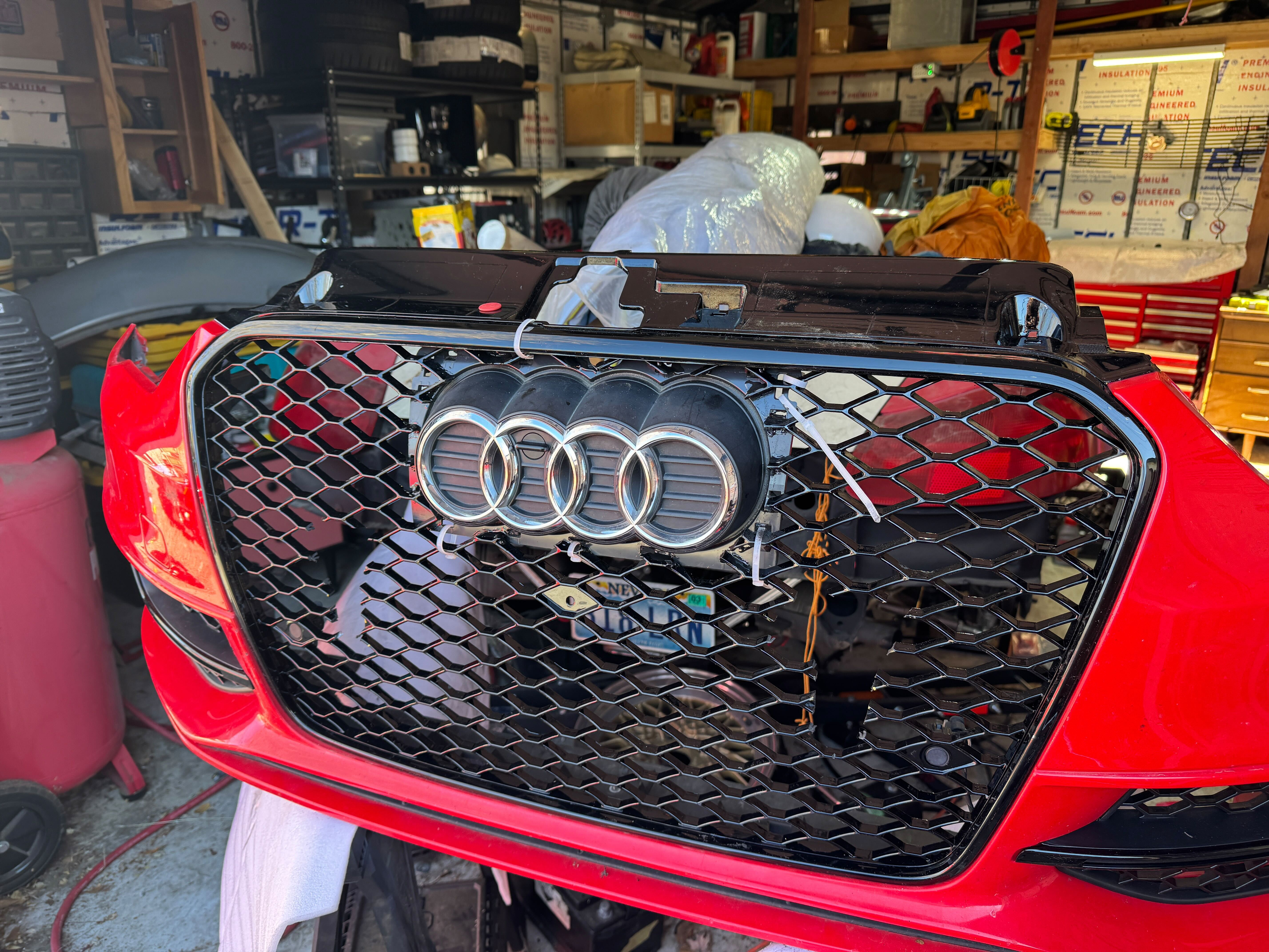 Knowing it would need some serious modification to fit the E-Tron's four-rings badge charging port door I ordered up a brand new S3-style mesh grille and matching brake duct grilles. Not only would this make the car look a bit more aggressive without the cutesy chrome, but it ditches the integrated Euro-style front plate bracket that looks like a nudity censor bar. Yeah, it's probably marginally aerodynamically less efficient, but sometimes we have to suffer for our art.