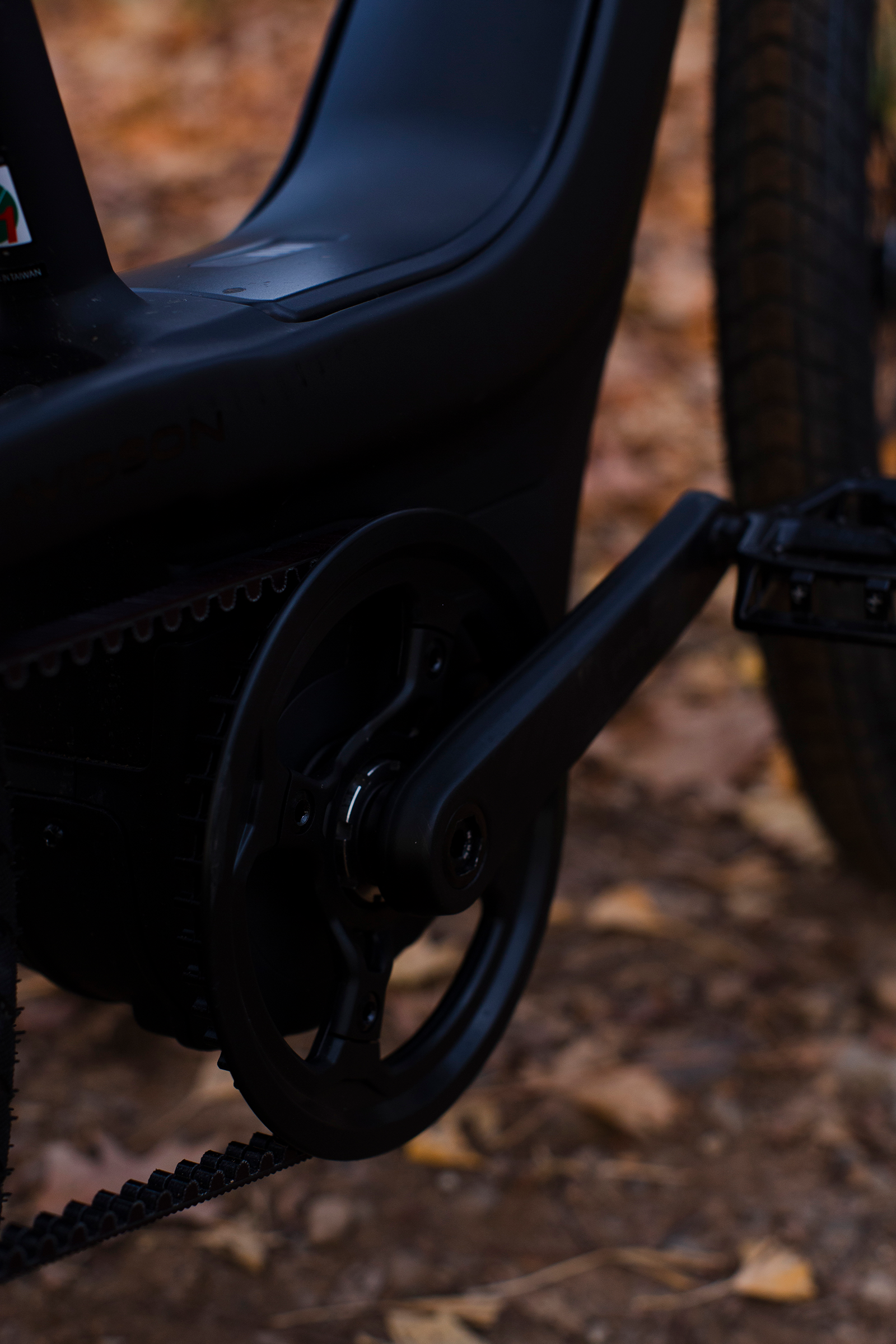 A mid-mounted Brose motor hides at the bottom of the bike, and the removable battery pack is tucked in front of it. The bulk of the bike is low down, and the extra open space in the frame's downtube is a lockable storage cubby. You also get belt drive, so there's no chain maintenance needed — and no chain lube to stain your socks. An integrated light at the front makes this thing as clean as it is practical.