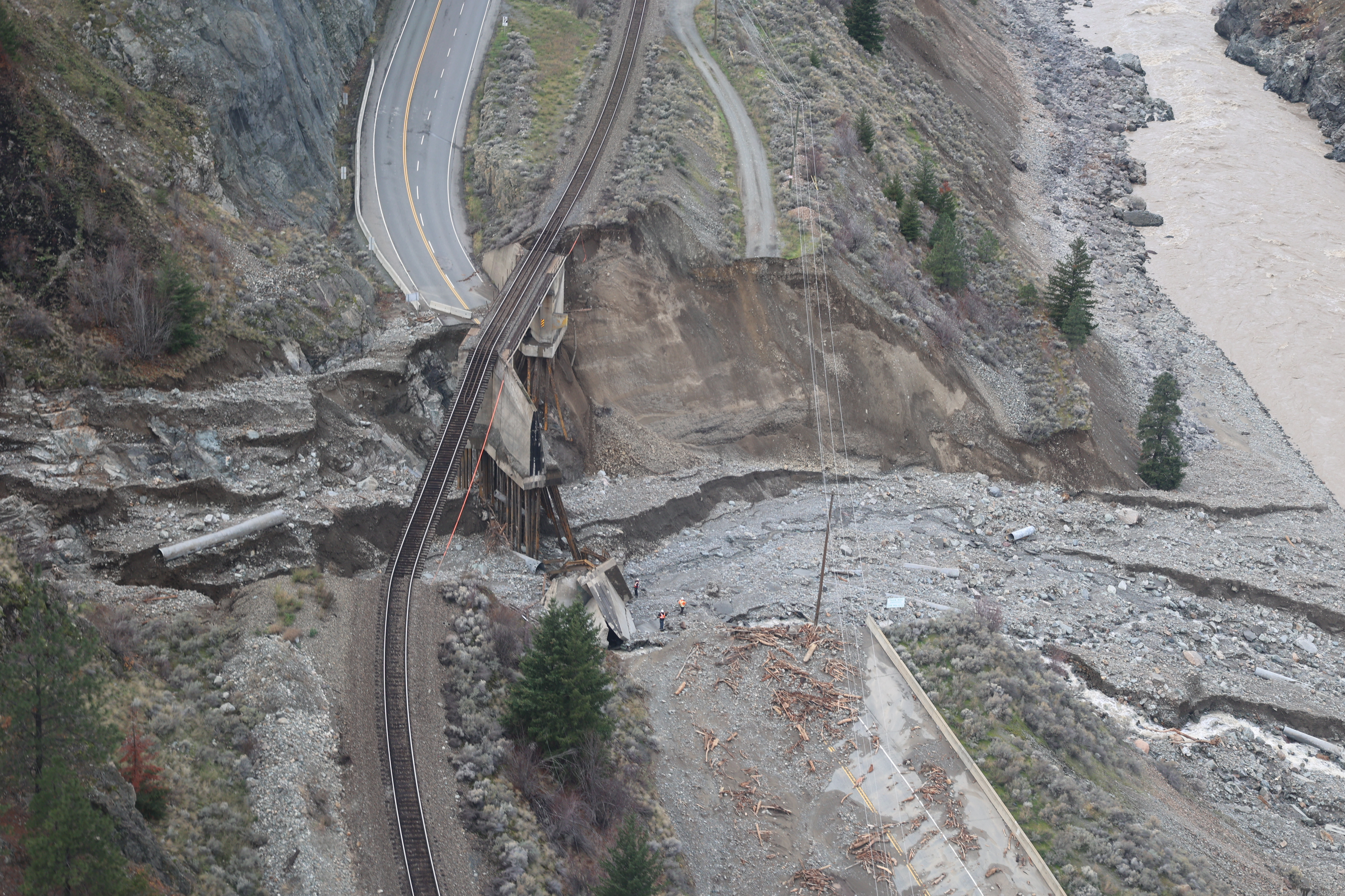Along with rebuilding the ground that was lost, CP's crews implemented what's called a shoofly track around the damaged bridge. This track is a temporary diversion to get the rail line running again and as a photo from Reddit user theadvenger shows, it cuts through what's left of the highway.