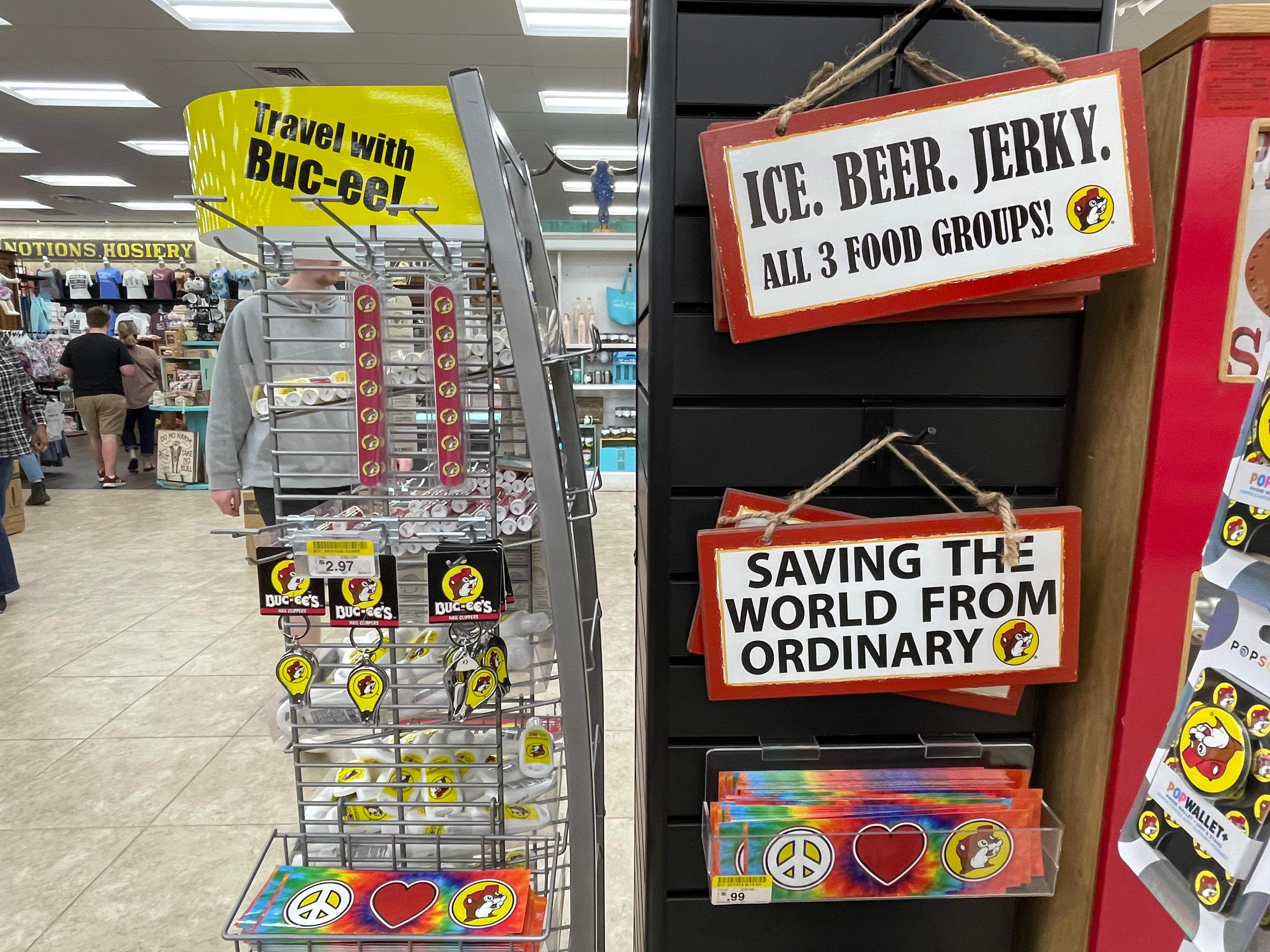 This is not your typical Love's or WaWa stop, which I thought were quite fancy to begin with. This is a travel center stop on steroids. Combine weird tourist attraction merchandise like a Disney World with a Home Goods vibe and traces of a K-Mart or Target and your local grocer, and you have Buc-ee's.