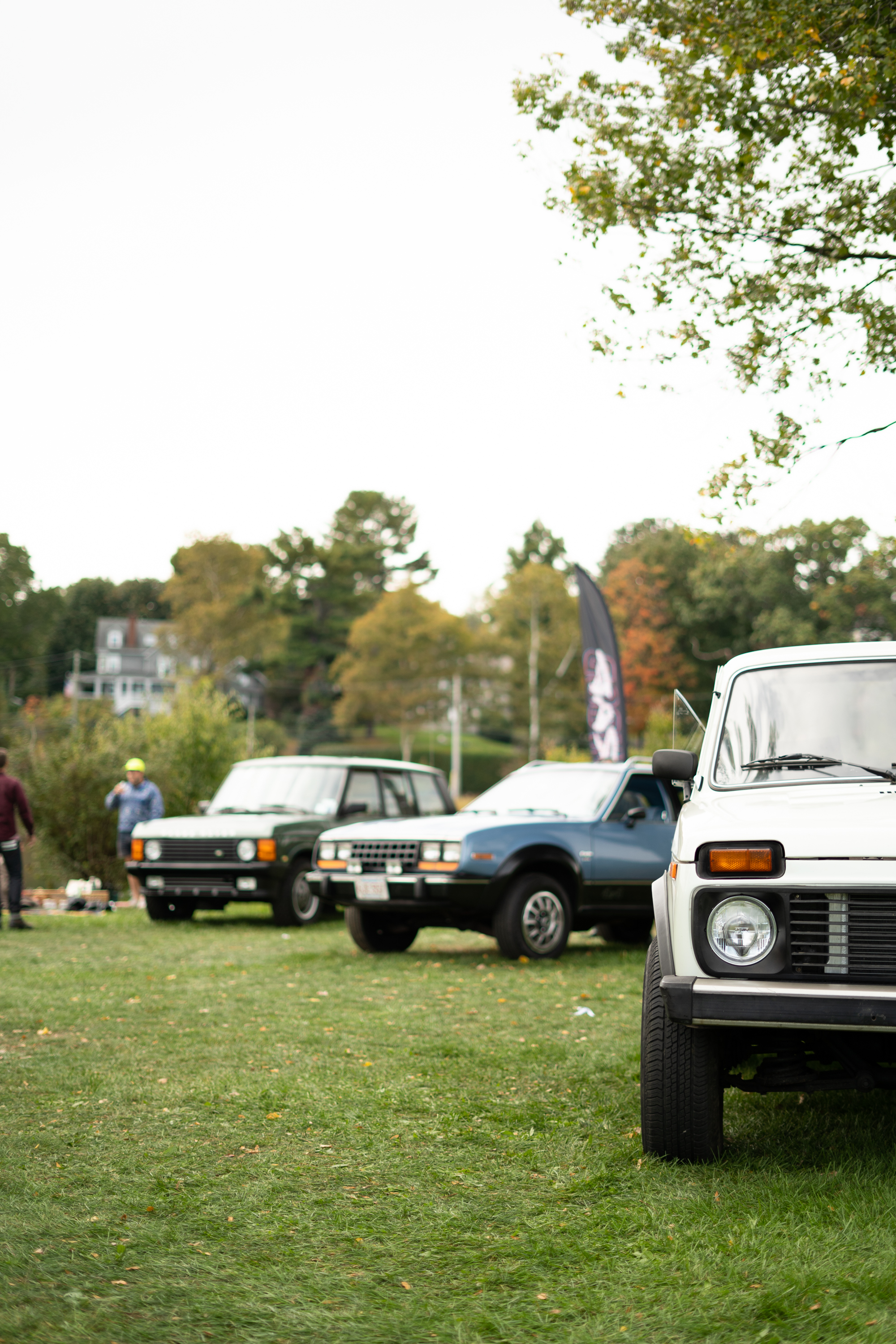 The history of the SUV/crossover craze, laid out on the grass in a Connecticut park. Technically, the Lada is also the present of the crossover craze.