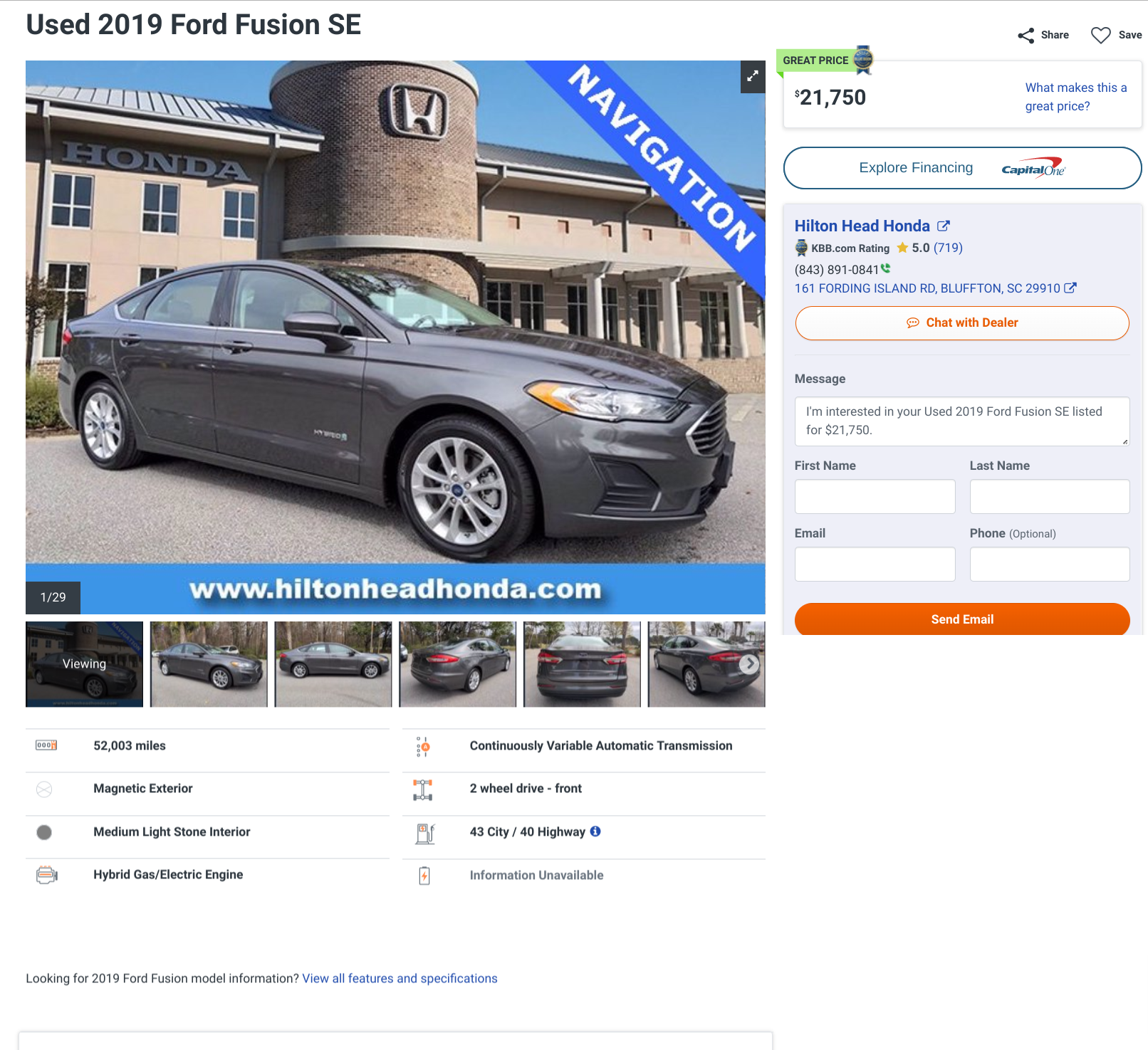 Ford made both a hybrid and a plug-in version of their popular Fusion sedan. The Energi PHEV offered up to 20 miles of pure EV range, while the hybrid offers 43 MPG city and 40 MPG on the highway. Inventory is really plentiful for these Fusions. According to Autotrader, there are almost 2000 units for sale that are 2016+ hybrid or PHEV under $25,000.