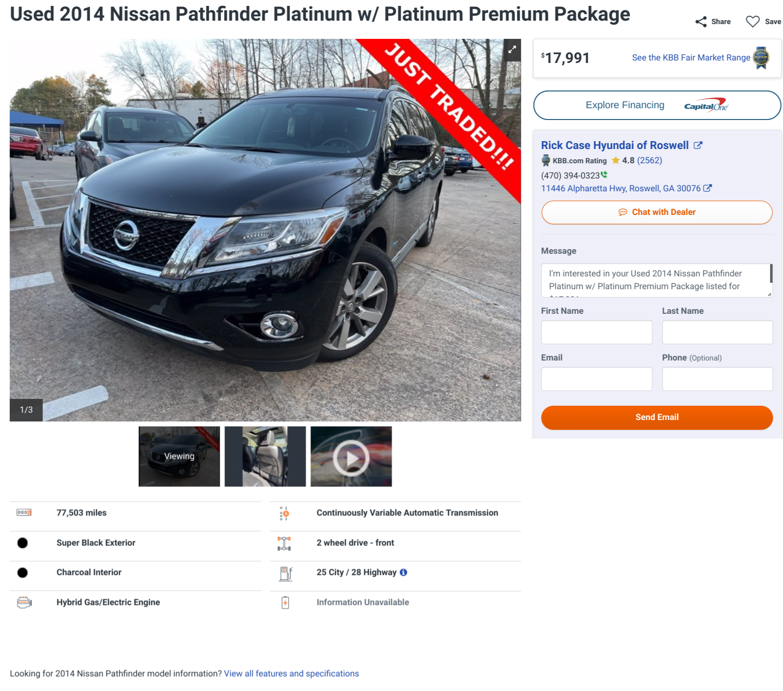 For a moment, Nissan decided that a hybrid version of their popular crossovers was a good idea, but unlike Honda and Toyota, it abandoned the idea. Both the Rogue and larger Pathfinder can be found with a hybrid, giving them slightly more respectable MPGs than the gas counterparts. These cars are fairly rare and most of the examples have higher miles.