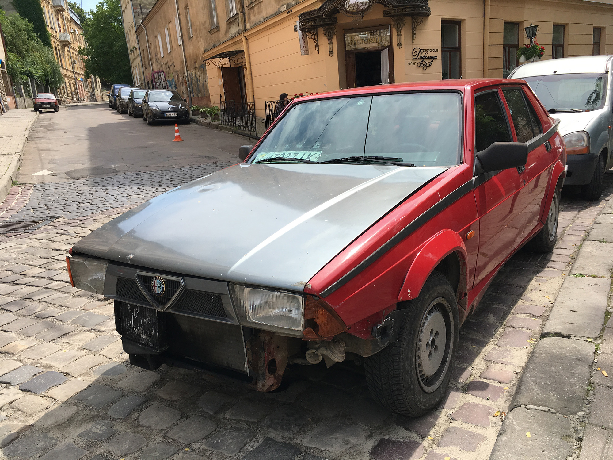After we woke up on our first day in in the city of Lviv, western Ukraine, it was time to find some breakfast. A stroll in a new city is fantastic for me as it feels like an unopened book, full of unexpected weirdness just waiting for me to find out about it. And what better to start that off than a really badly beaten Alfa Romeo 75, missing large parts of its front end and its hood the wrong color.