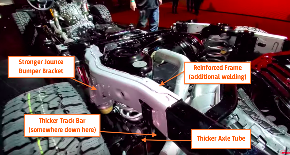 I asked Brandon Girmus, the Jeep Gladiator's brand manager about those frame and axle reinforcements, which you can see illustrated on the naked chassis on the floor of the Chicago Auto Show (shown in the TLF Truck video below). He told me that, for the frame, overall thickness stays the same, though there's some "additional welding for added strength" from roughly the Gladiator's B-pillars rearward.