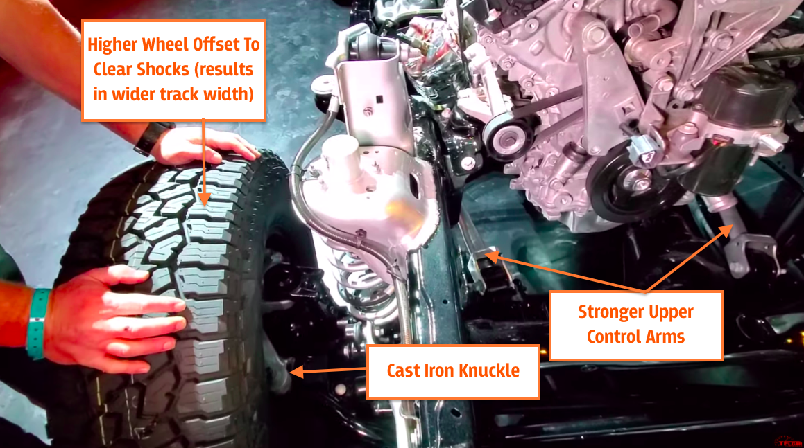 The shock mounts on the frame are also stronger, as are the upper control arms reaching to the front Dana 44 axle, which gets its own tougher shock mounts and also cast-iron knuckles in place of the non-Mojave Gladiator's cast aluminum ones.