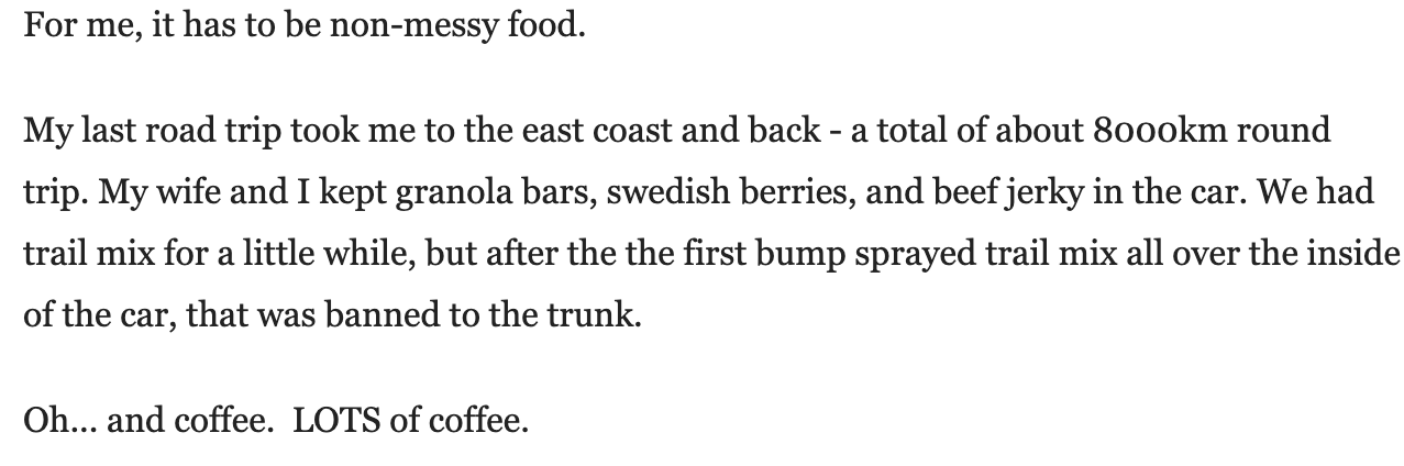 Snacking while driving can be beneficial, especially on long trips. Snacks that are crunchy or require extra effort like my favorite sunflower seeds can keep you alert and stop you from falling asleep. Other times it can be a good distraction, especially if you're in a car full of sleeping people. Some of us prefer sweet, some of us go straight for the salt. Here are your favorites.