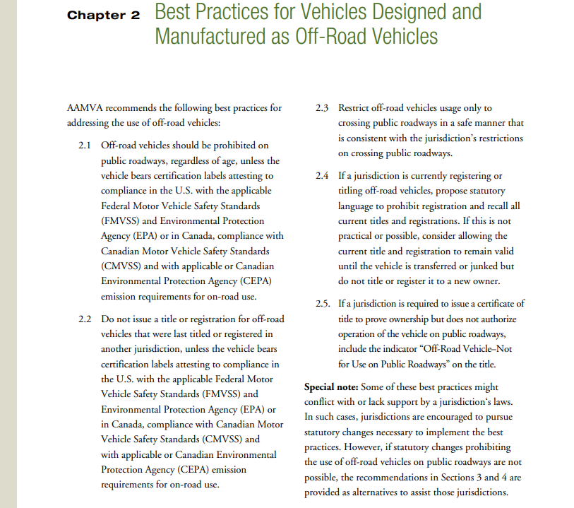 Special note: Some of these best practices might conflict with or lack support by a jurisdiction's laws. In such cases, jurisdictions are encouraged to pursue statutory changes necessary to implement the best practices. However, if statutory changes prohibiting the use of off-road vehicles on public roadways are not possible, the recommendations in Sections 3 and 4 are provided as alternatives to assist those jurisdictions.
