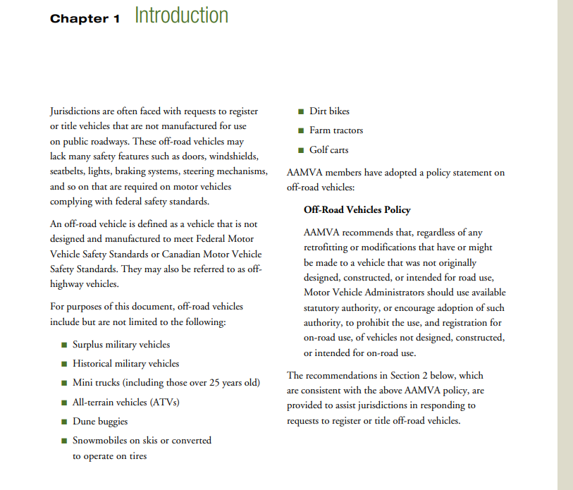 Older documents circulated to AAMVA members deferred to the National Highway Traffic Safety Administration. The NHTSA classifies an off-road vehicle as a vehicle not designed for on-road use that does not meet FMVSS standards. However, the NHTSA also notes that imports that are 25 years and older are exempt from meeting said standards.