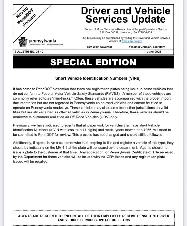 To answer the question of why: The states are simply following the guidance of the AAMVA. This isn't new as states often do draw on the AAMVA for changes to their driving laws. The difference now is that the AAMVA has become a bit more aggressive against mini trucks. The best practices document against mini trucks can even be found on current versions of the AAMVA the Week in Review newsletter, viewable by AAMVA members.