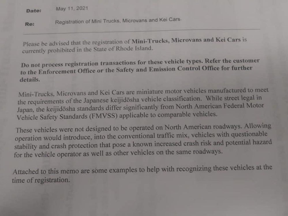 To date, Rhode Island has not given any explanation. Instead, the state is sending letters to owners of imported vehicles telling them that their cars are "unsafe" and "unfit." Meanwhile, an internal memo was allegedly sent to state DMV offices instructing employees to not process registrations because kei cars are not built to FMVSS standards. While the public-facing explanations are different, both of these states appear to be using the same underlying reasoning.