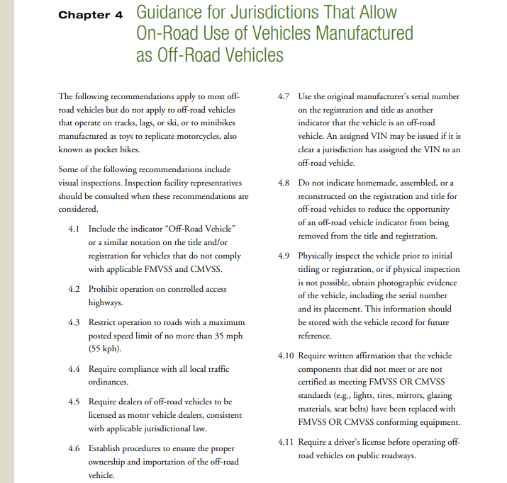 In 2021, Maine's BMV, with the help of the DMVs of Georgia, Colorado and South Dakota published Regulation of Off-Road Vehicles: Best Practices, which clamps down on imported vehicles in a weird way.