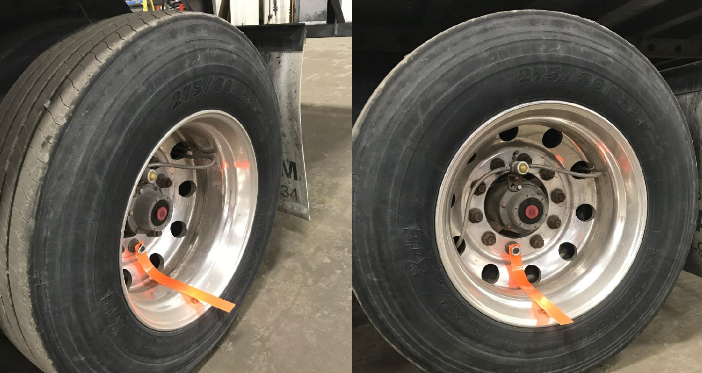 Take a drive around Chicago, its suburbs and rural Illinois, and you're bound to see the loose wheel nut indicators that Jason talked about yesterday. Weirdly, you won't see them on our buses — not even my Nova Bus has them. But you will see them on trucks getting goods to their destinations. And if you take a closer look at the trucks pulling trailers you might see another handy tool to aid truckers: the wheel rotation indicator.