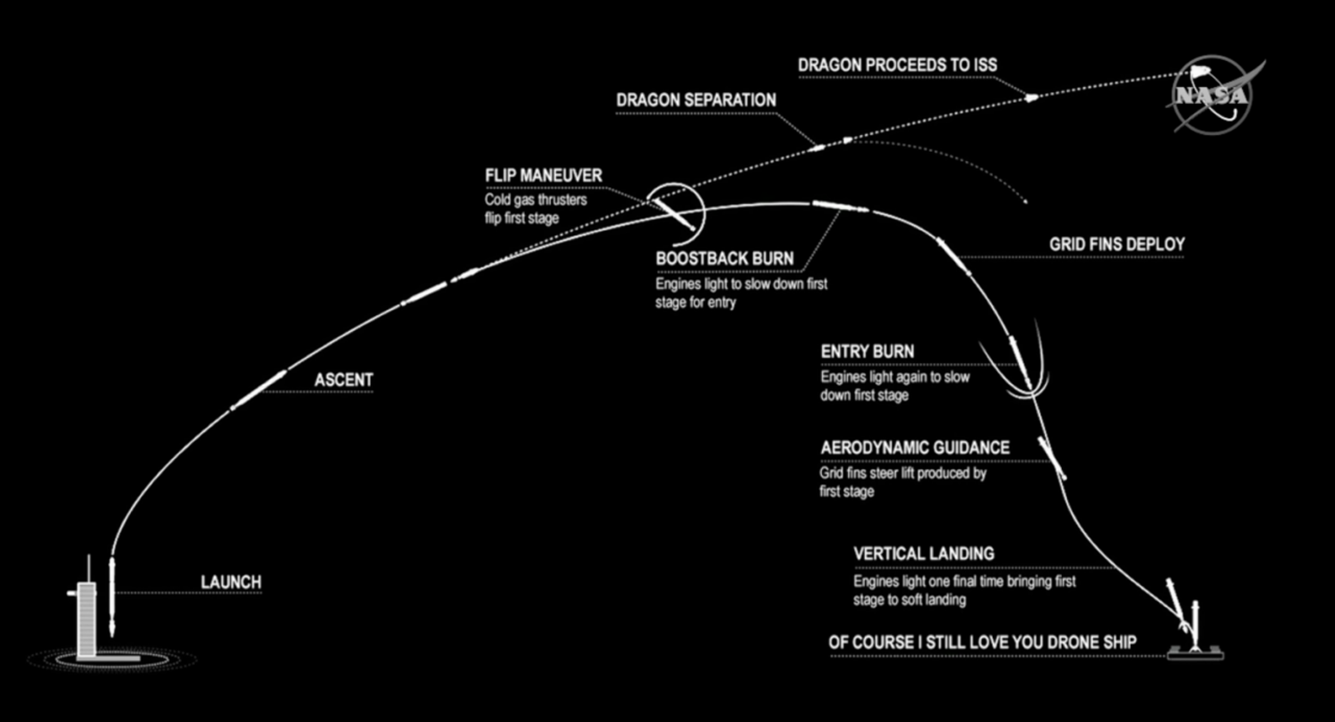 NASA has also released some diagrams of the flight plan; in another first, this will be the first crewed capsule where the launch vehicle returns via a controlled landing. Shuttle solid rocket boosters (SRBs) were recovered from the sea, but they just parachuted into the water. The SpaceX Falcon 9 lands on a barge: