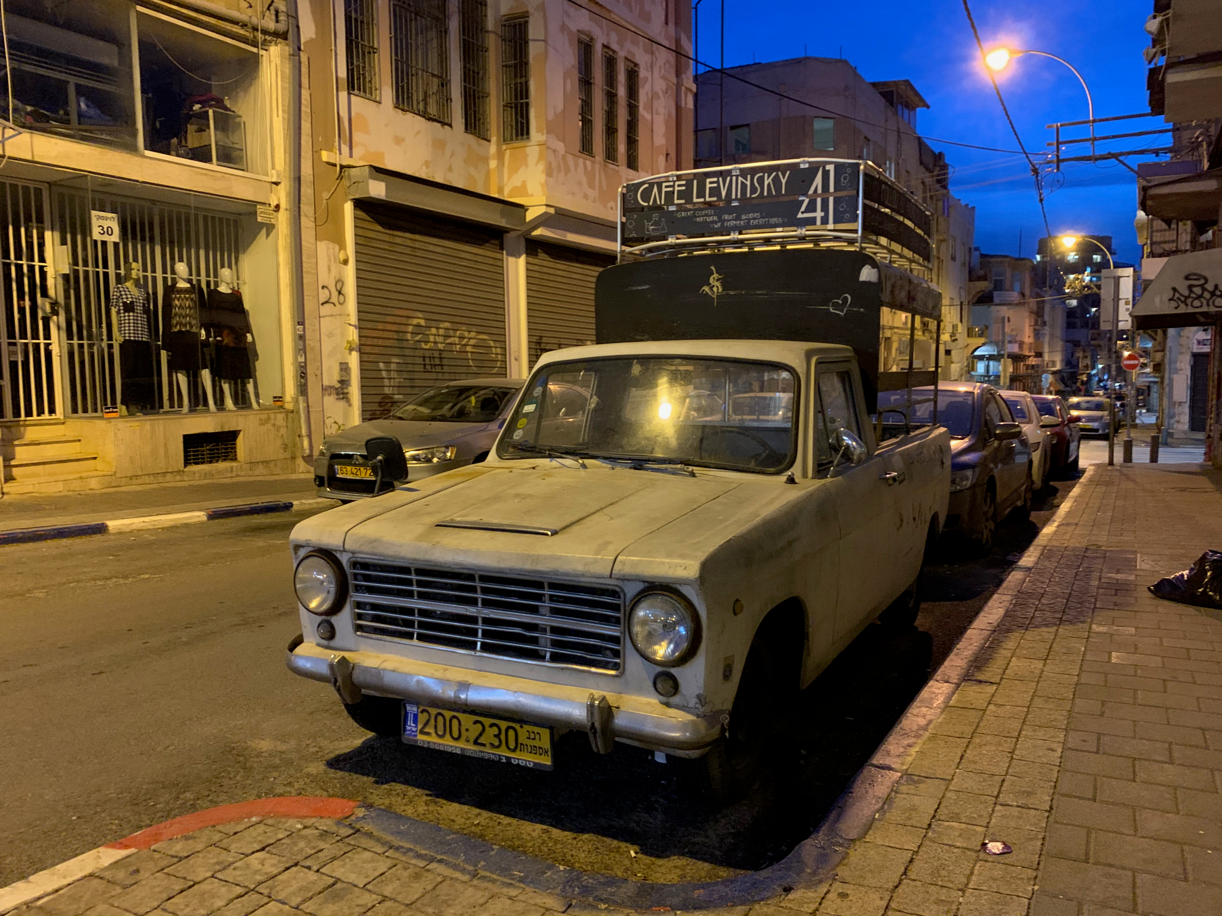 One of those coffee spots, the aptly named Cafe Levinsky, has a relic of an older, more naive, more provincial Israel out front playing dual purpose as a billboard and a little seating area. This fiberglass-bodied Rom Carmel pickup was one of the only cars designed and built in Israel. You don't see them often as the climate has not been kind to their rudimentary composite bodywork, but this one is something of an icon.
