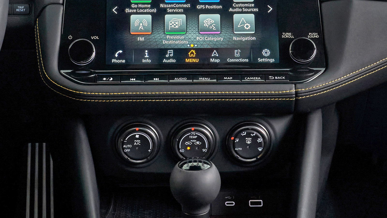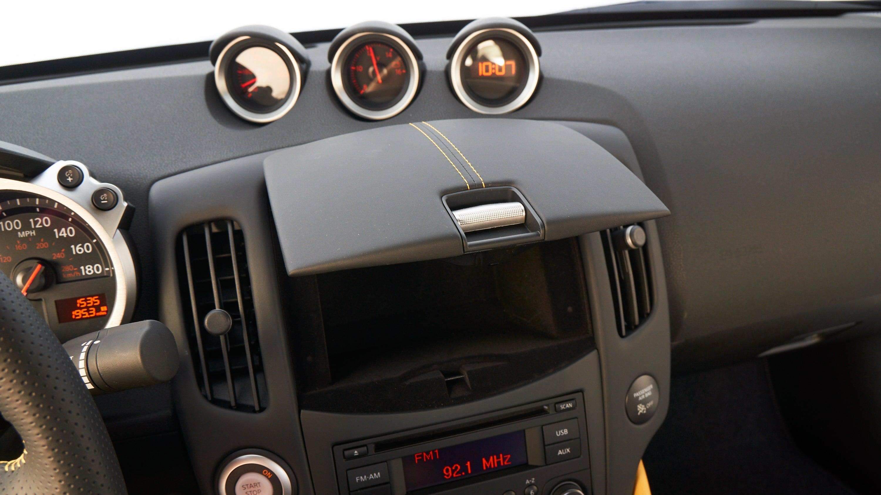 In the new Z, the three dials used for climate control — fan speed, temperature and position — look to be carried over wholesale from the previous car. The parts and their layout are unchanged. But the new Z offers a nice little storage cubby below them, which is particularly handy in a small interior.