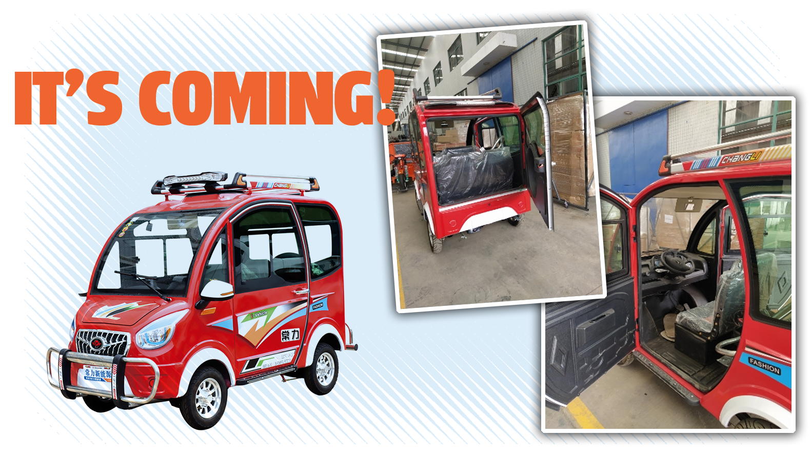 Hot damn, right? Look at that baby! It's got the CHANGLI-branded roof rack, full stripe kit that, for some puzzling reason includes the word "FASHION" on it, and a few details I didn't notice before, like the fact that it seems to be center steer and has a little lone sunvisor with a vanity mirror.