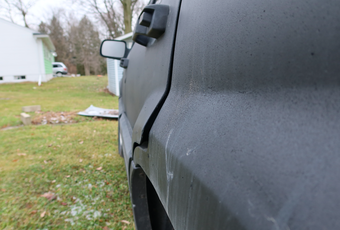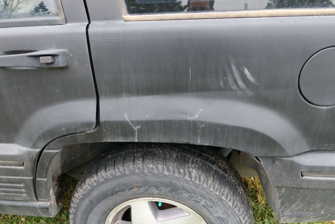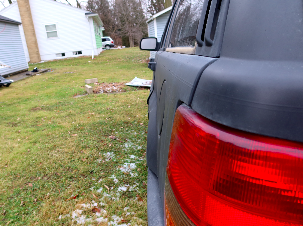 It may be hard to tell in the photos, but the rear driver's side quarter panel is pushed in a bit just ahead of the fuel filler door. Notice how the rear door juts out farther than the quarter panel; The two should be flush: