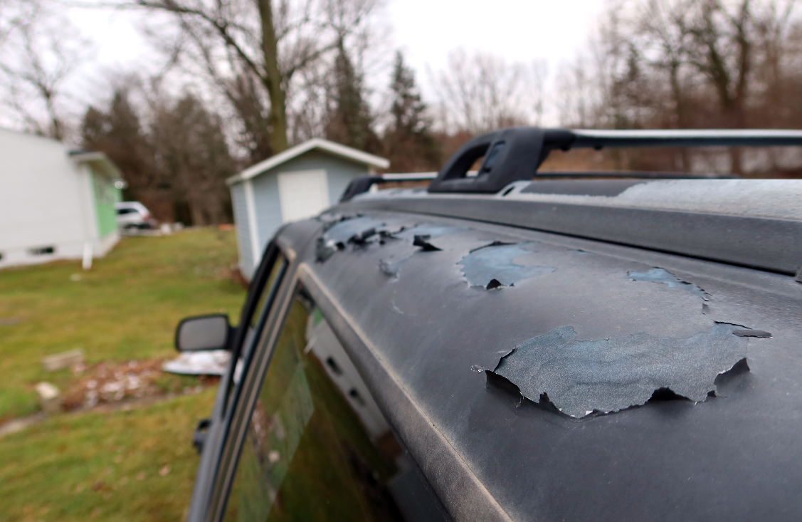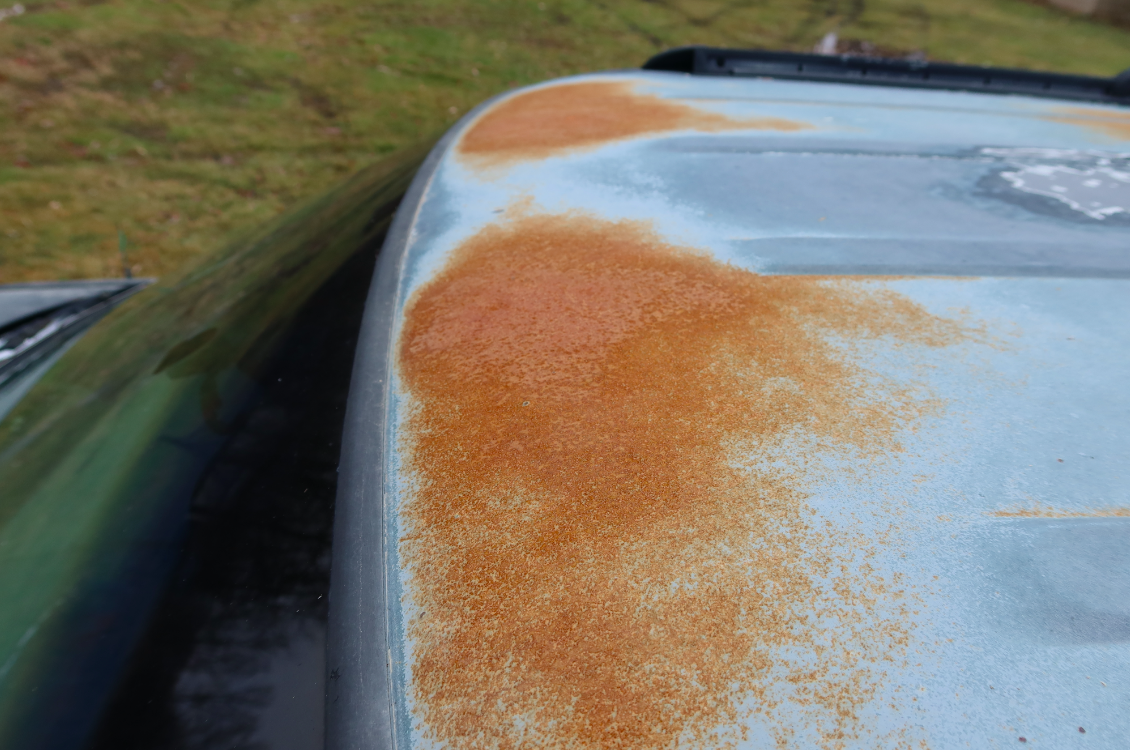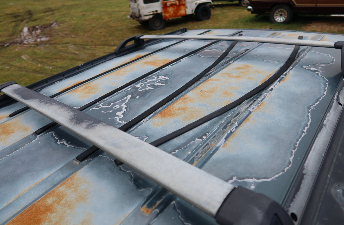 And the roof got hit hardest by the sun. You can see lots of clear coat peeling, some surface rust, and some plastic roof rack strips coming undone.