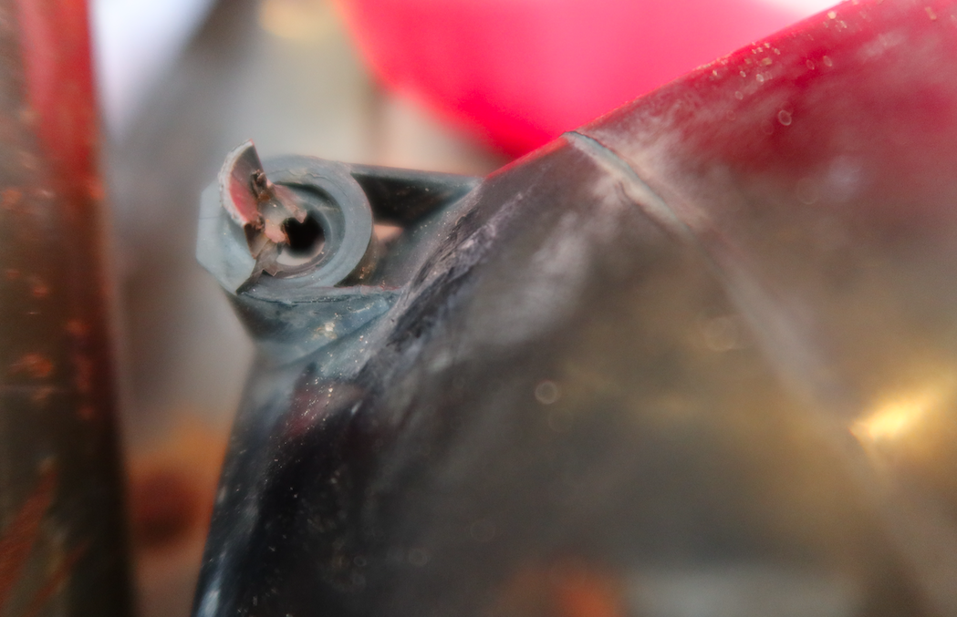Obviously, the headlight on the driver's side is in bad shape because a little plastic clip that's meant to push over a ball stud is broken: