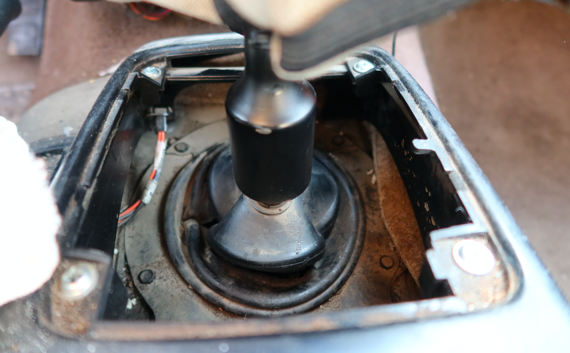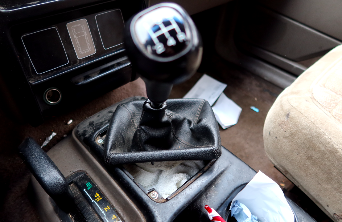 All the clips holding the shift boot's plastic bezel to the center console are broken, and now the boot lifts up and reveals a white towel, which I assume someone stuffed in there to quiet down the transmission noise.