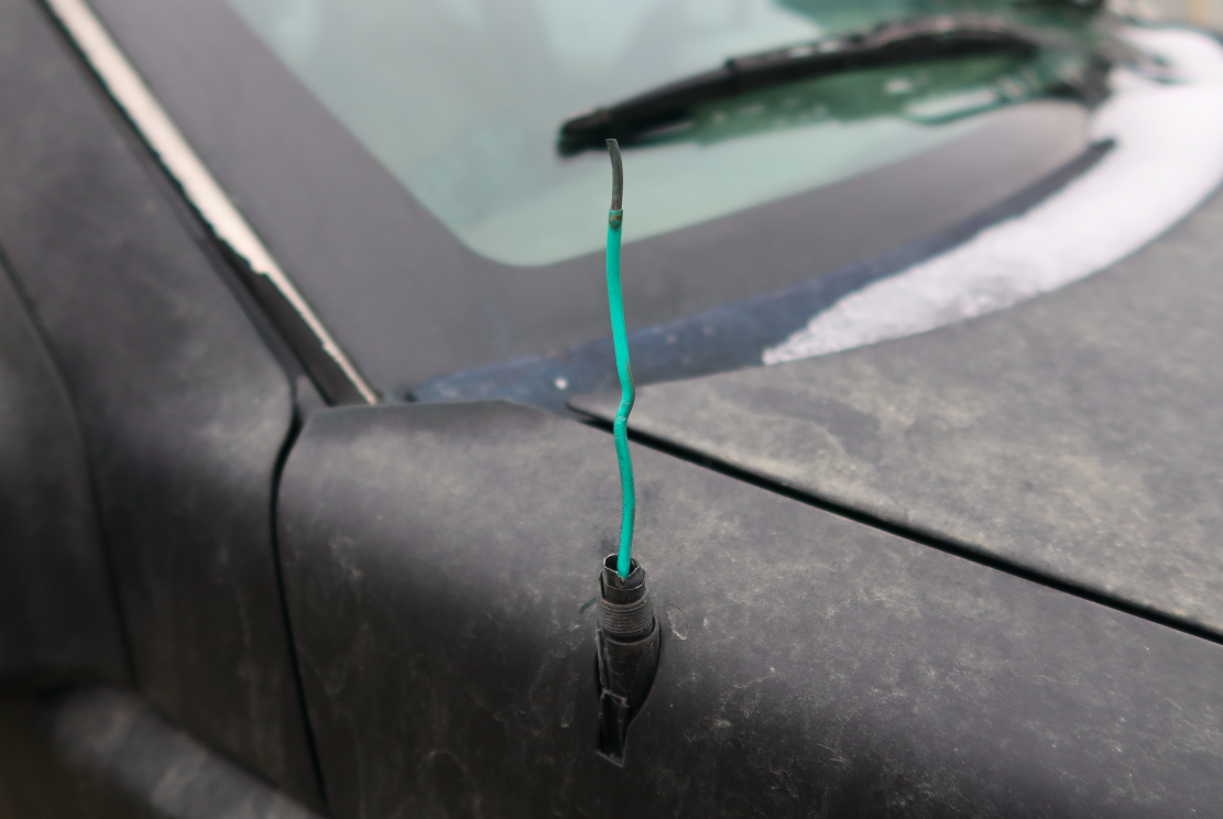 I don't know what happened to the power antenna, but it's broken and has been replaced by a little wire. I can still hear the antenna's motor spin when I turn the car off, so I bet I can fix this without too much fuss.