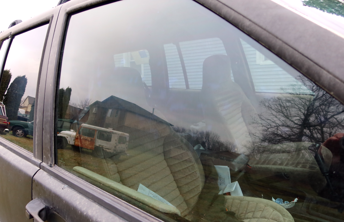 The passenger's side front window has tinted glass that makes everything outside look blurry. I think someone tried to tint the fronts themselves, and did a terrible job at it.