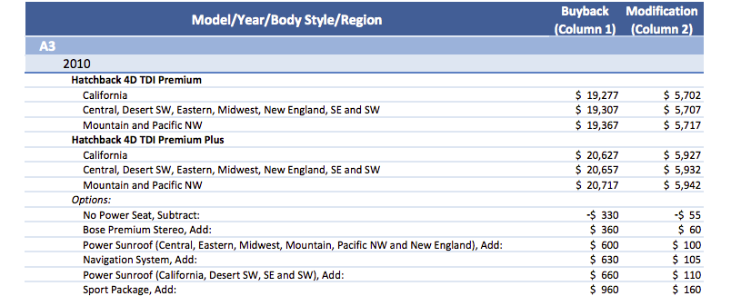 The buyback column is essentially just the September 2015 (that's when the Dieselgate story broke) NADA value plus the payout number in the "modification" column.