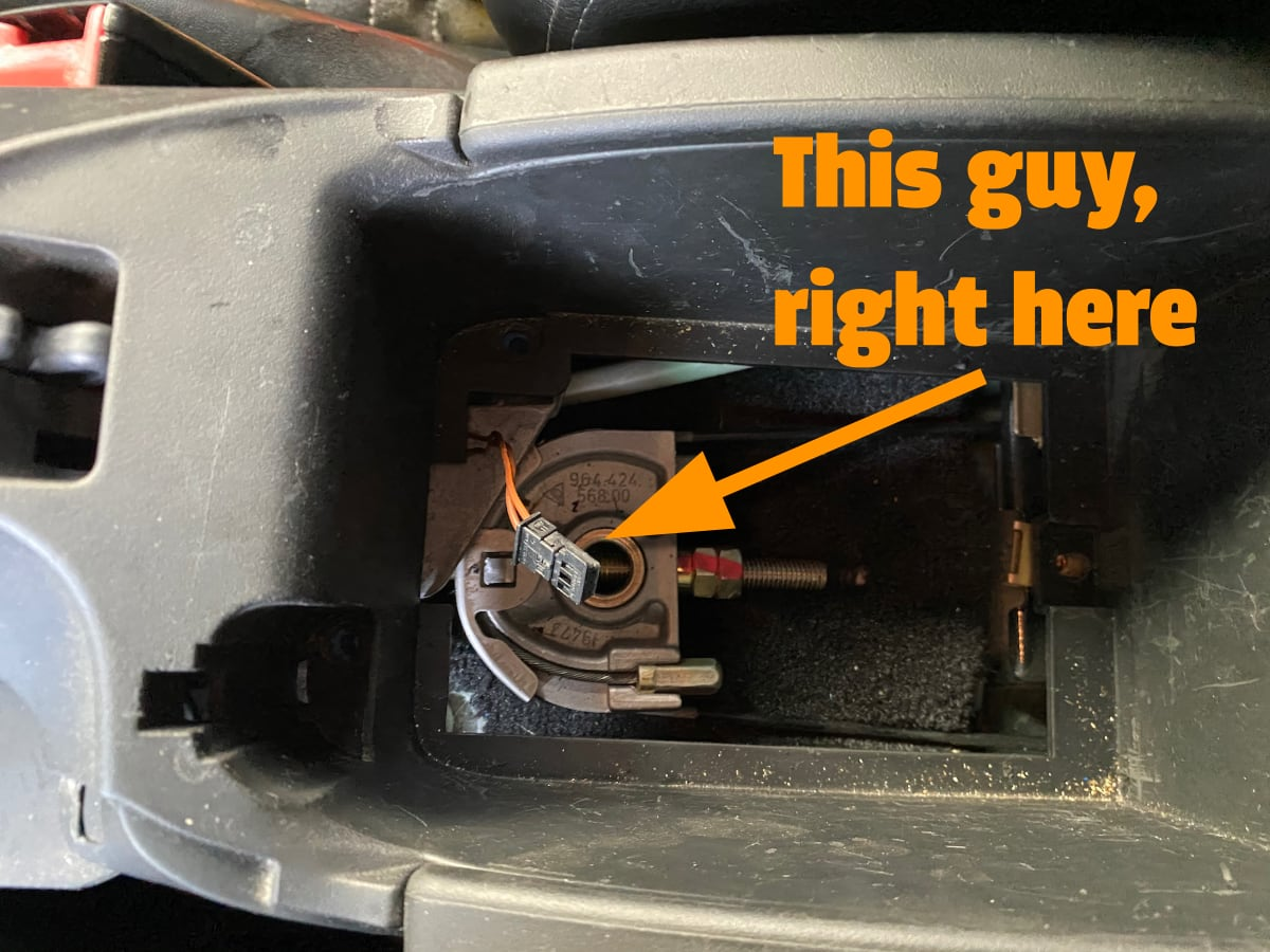There was yet another puzzling Porsche perplexment 0n my car that was driving me a little nuts. The early 986 lacks a traditional dashboard glovebox, but it does have a locking cubby under the armrest in the center console. Inside that cubby, I discovered a wired connector poking out from under the lip of the floor. That was connected to a free-floating spring-arm microswitch. Turning once again to my trusty Bentley book, I traced that to the security system. Turns out, that wire and switch shouldn't just be flopping loosely in the cubby. It should be connected to the cubby latch.