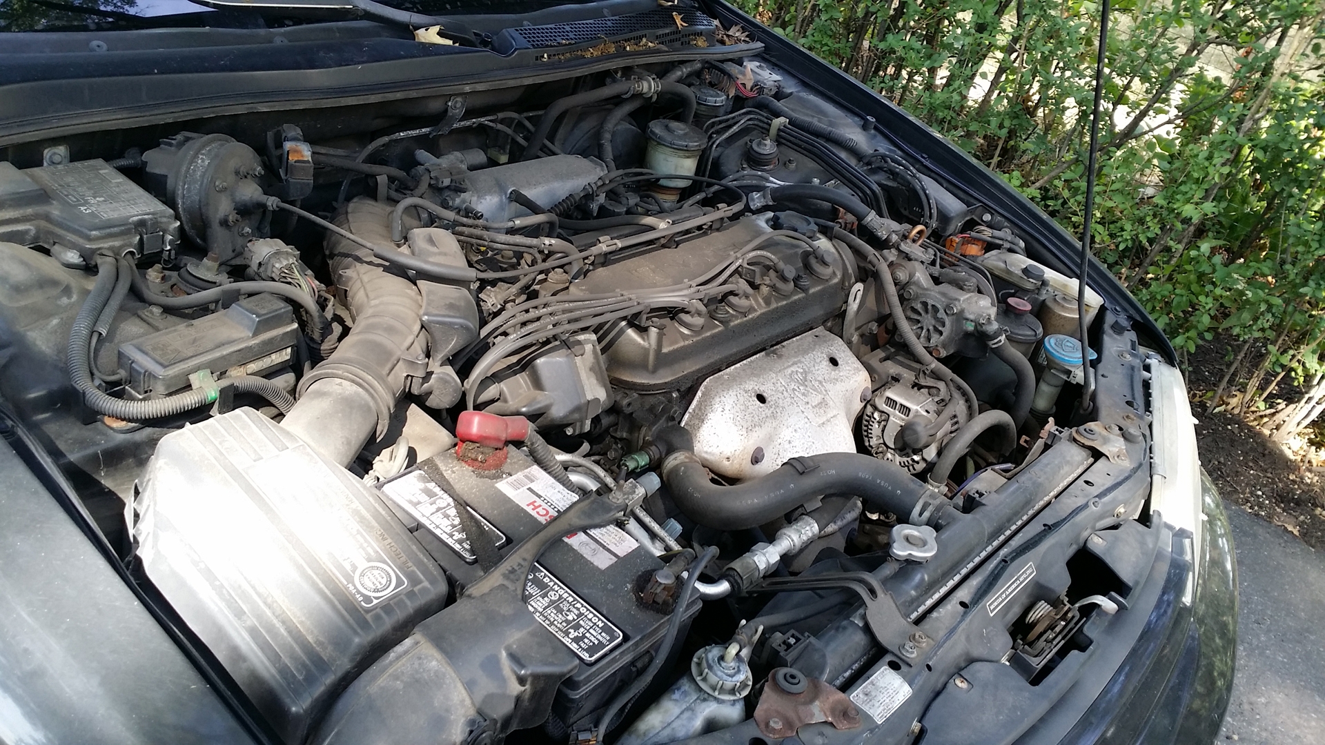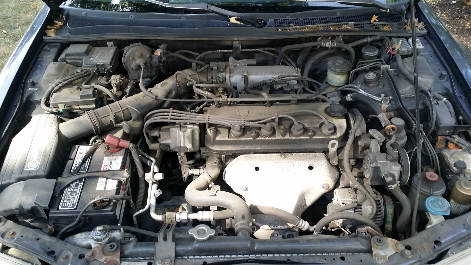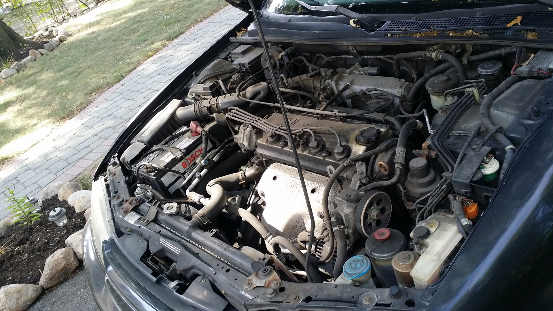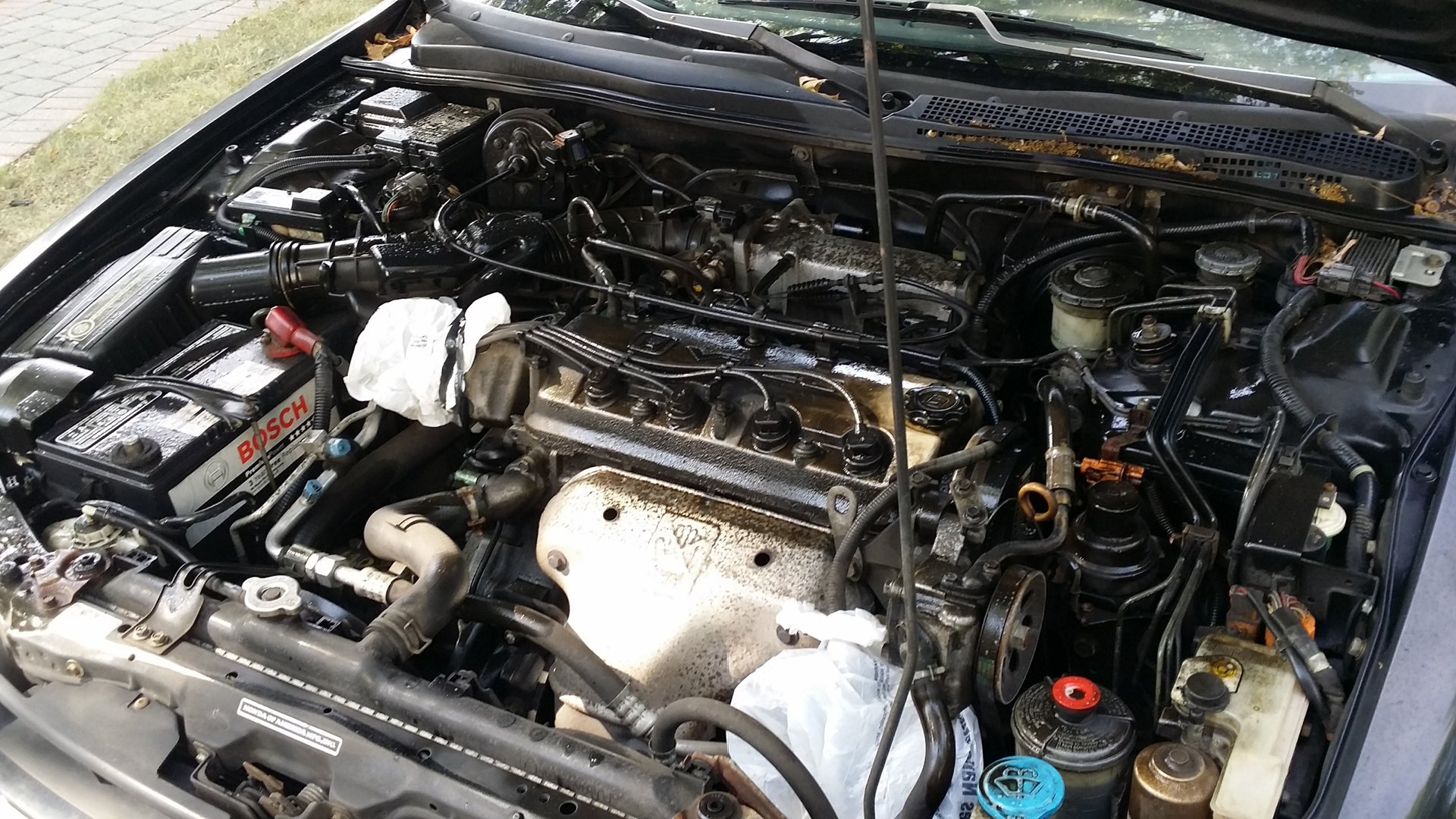 For today's demonstration, I'm using my 1995 Honda Accord EX with 171,000 miles of dirt and debris concentrated in its engine bay. Here's the car as I got it, in all of its oil-soaked glory:
