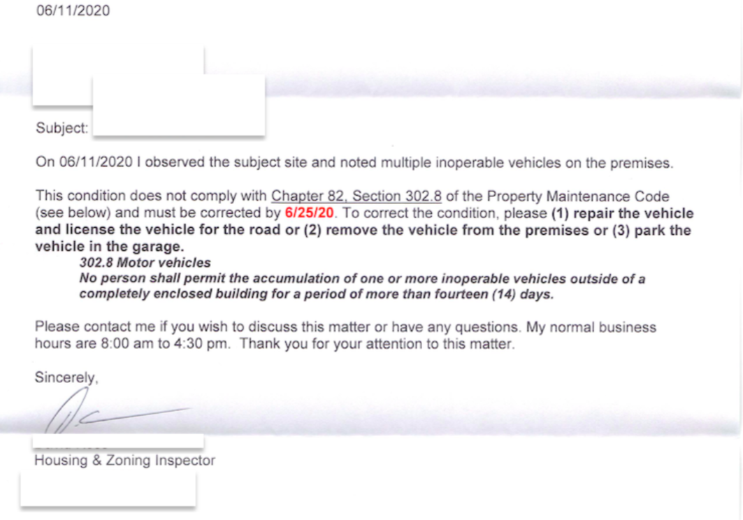After telling me that I had to get the parts and tools off my driveway, the city inspector ultimately decided that my yard looks pretty enough, so all is well.