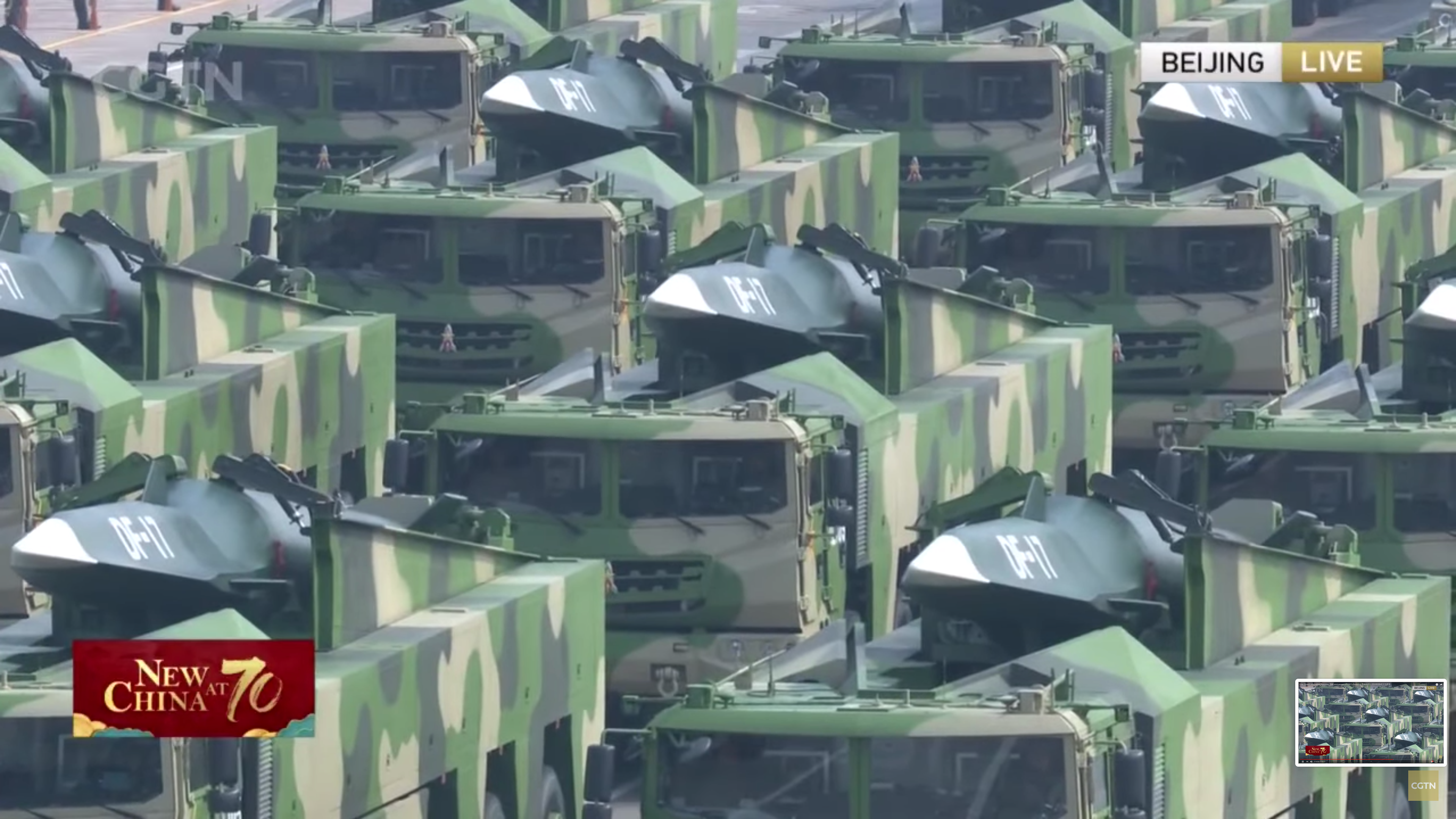 This is something you don't see every day: a sea of hypersonic missiles. The DF-17 hypersonic missile appeared for the first time in the parade and is the first hypersonic weapon system in service with any country. In other words, if all of these weapons really are operational, China beat America again.
