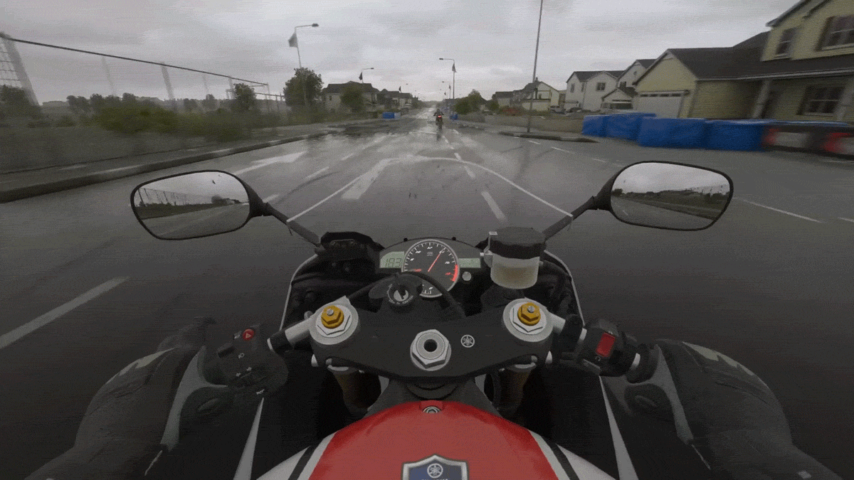The sheen of wet asphalt and sporadic puddles create a sense of depth and intricacy to a world that doesn't exist during sunny, dry conditions. The same goes for water drops and streaks on the metallic bodywork of a bike. And when all of these things are whizzing past you at 180 mph, as Morgan notes, you don't have the time to nitpick parts of the environment that don't quite pass the photorealism test.