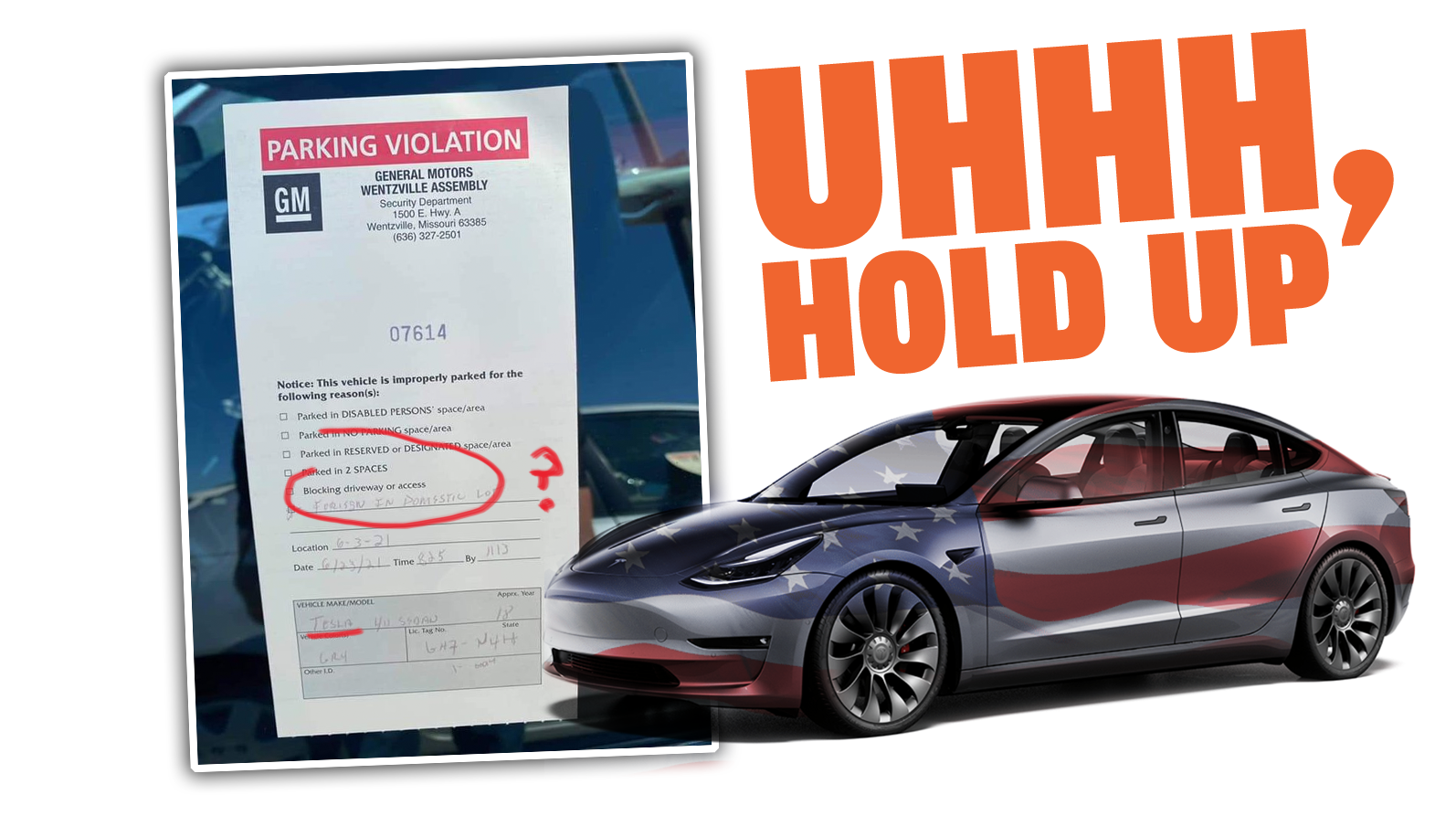 As you can see on the ticket, the offense is "FOREIGN IN DOMESTIC LOT" and the car is listed as a "gray 2018 Tesla 4D sedan," which would, of course make this ticket, um, wrong.