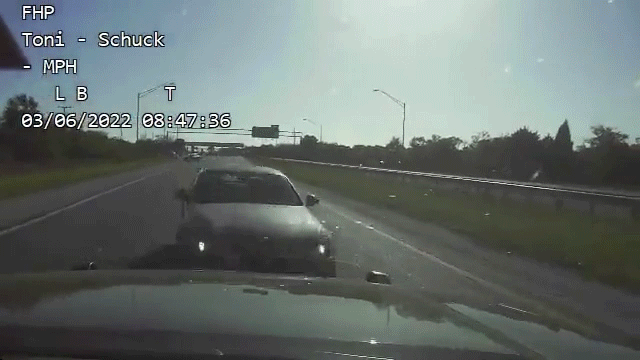 Fortunately, a Florida Highway Patrol trooper was able to put her Chevrolet Tahoe into the path of the BMW. Trooper Toni Schuck was parked a half-mile from the race's finish line and was the runners' last line of defense. The BMW was traveling at speeds of at least 70 MPH, and no other officer was able to stop the sedan. Schuck positioned her SUV in the middle of the interstate and took a head-on collision to stop the BMW.