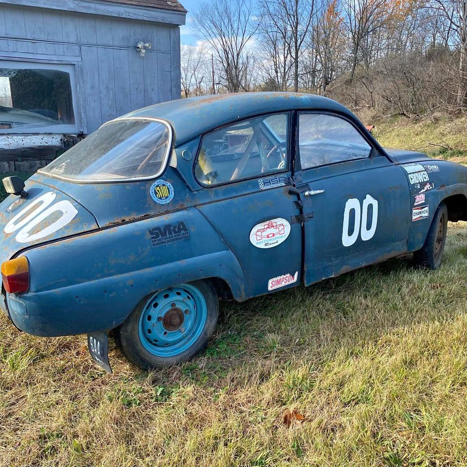 There isn't much left of this Saab. No engine, little interior, plenty of body bits lost to rust — it's less a car than an assemblage of parts in the vague shape of a car. You're not going to be driving it home, or for plenty of time after you get it there.