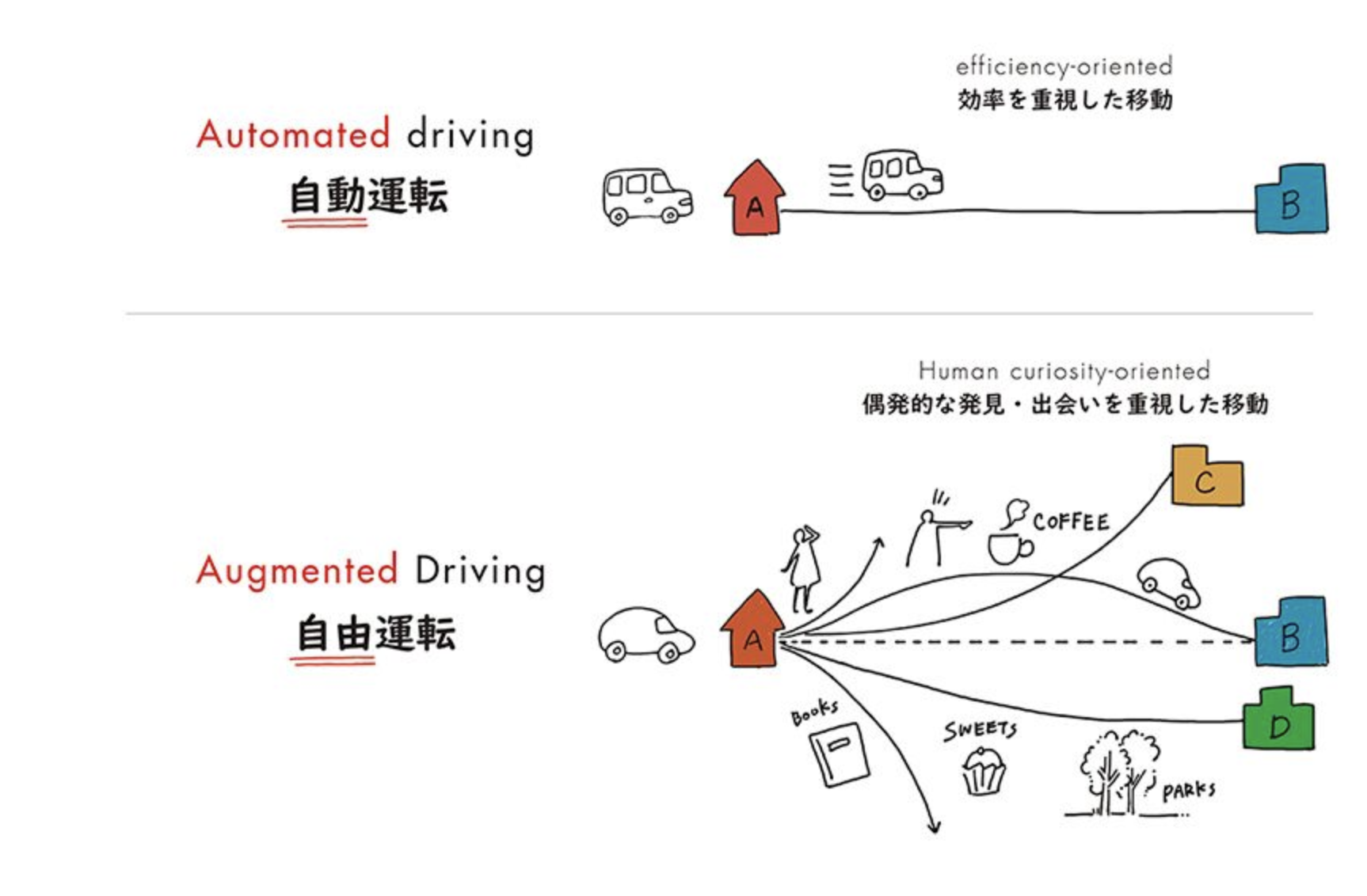 This diagram actually gets across the concept well: you can have an autonomous car to take you somewhere with robotic efficiency, or this Augmented setup that lets you bop around like a distracted magpie to whatever snatches your attention and the car will keep you from running into any trees, books, or giant cupcakes.